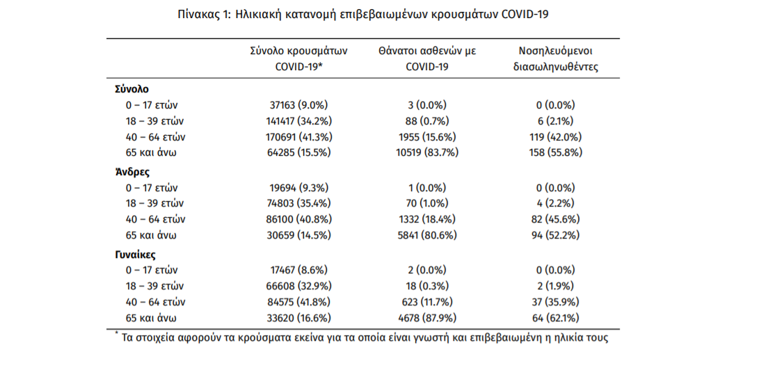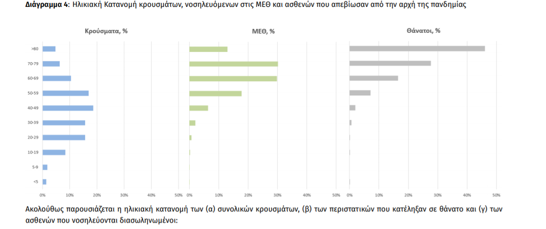 Ο αριθμός των ασθενών που νοσηλεύονται διασωληνωμένοι είναι 283 (63.6% άνδρες). Η διάμεση ηλικία τους είναι 66 έτη. To 83.4% έχει υποκείμενο νόσημα ή/και ηλικία 70 ετών και άνω. Από την αρχή της πανδημίας έχουν εξέλθει από τις ΜΕΘ 2.615 ασθενείς. Οι εισαγωγές2 νέων ασθενών Covid-19 στα νοσοκομεία της επικράτειας είναι 48 (ημερήσια μεταβολή -27.27%). Ο μέσος όρος εισαγωγών του επταημέρου είναι 65 ασθενείς. Η διάμεση ηλικία των κρουσμάτων είναι 43 έτη (εύρος 0.2 έως 106 έτη), ενώ η διάμεση ηλικία των θανόντων είναι 78 έτη (εύρος 0.2 έως 106 έτη)