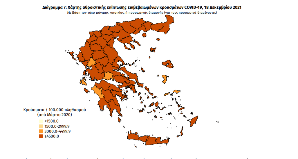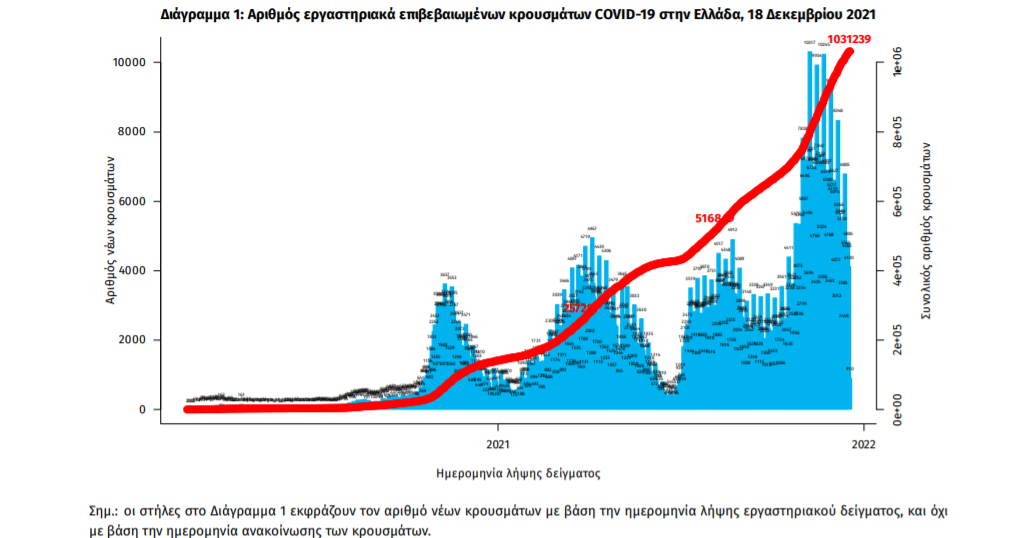Τα νέα εργαστηριακά επιβεβαιωμένα κρούσματα της νόσου που καταγράφηκαν τις τελευταίες 24 ώρες είναι 4.345 , εκ των οποίων 11 εντοπίστηκαν κατόπιν ελέγχων στις πύλες εισόδου της χώρας. Ο συνολικός αριθμός των κρουσμάτων ανέρχεται σε 1.031.239 (ημερήσια μεταβολή +0.4%), εκ των οποίων 50.5% άνδρες. Με βάση τα επιβεβαιωμένα κρούσματα των τελευταίων 7 ημερών, 207 θεωρούνται σχετιζόμενα με ταξίδι από το εξωτερικό και 3.409 είναι σχετιζόμενα με ήδη γνωστό κρούσμα.