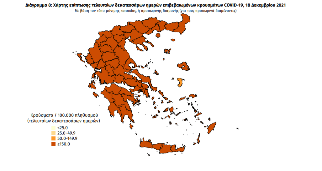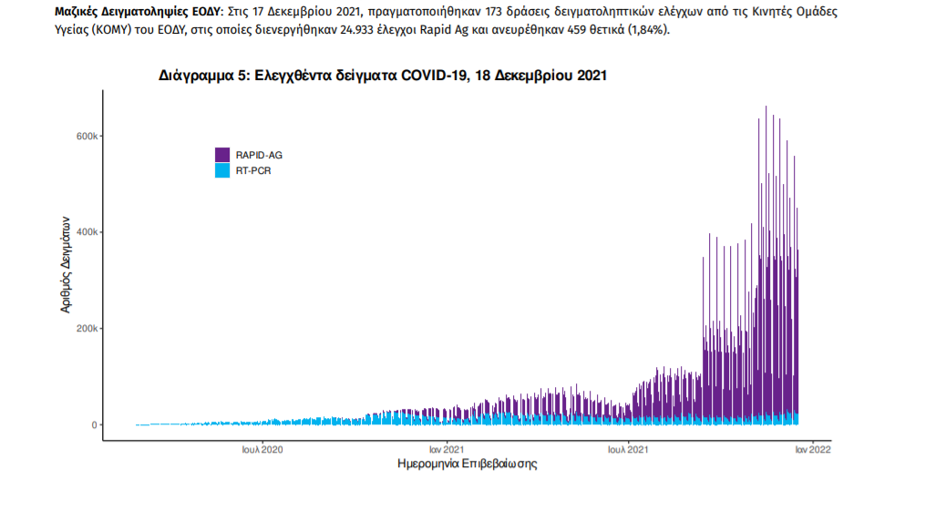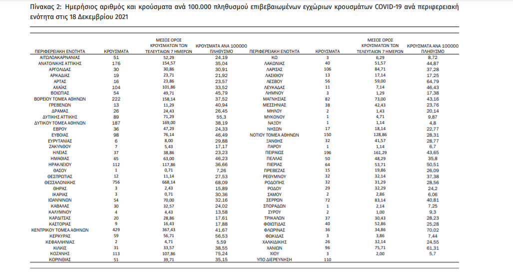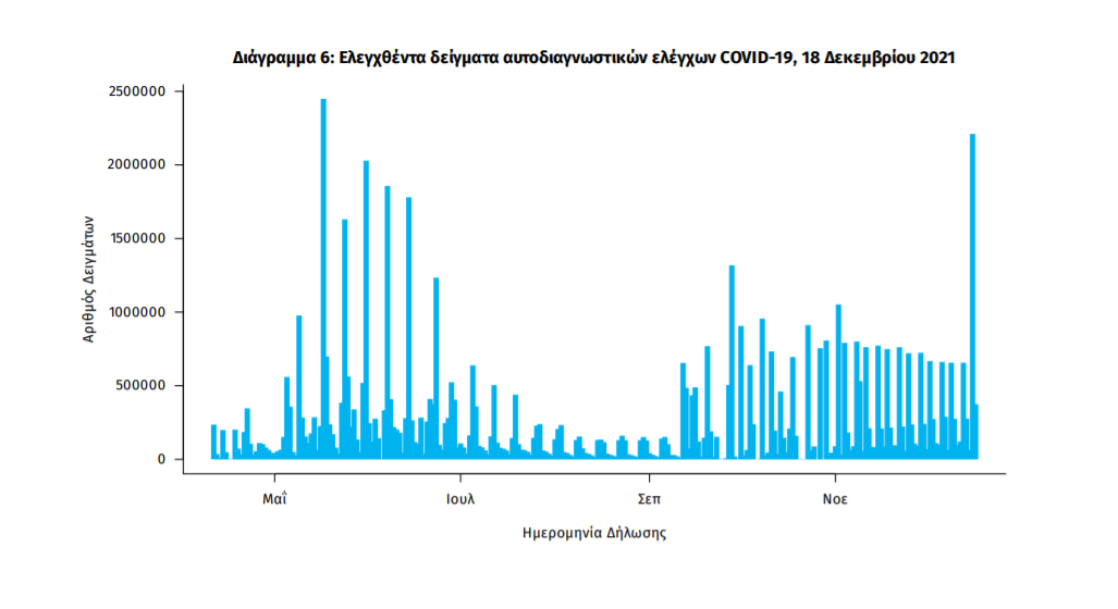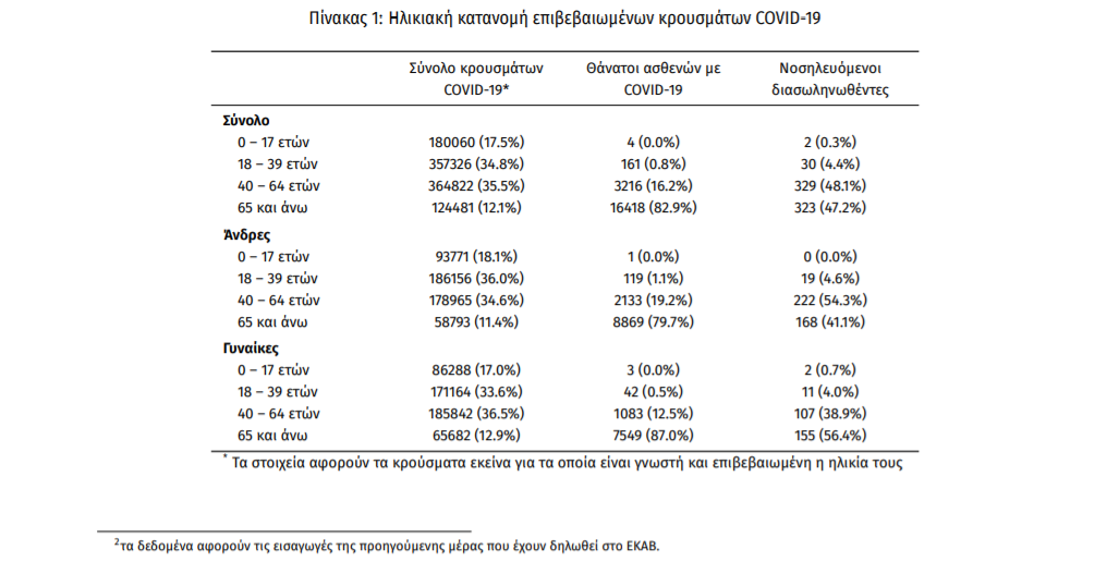Ο αριθμός των ασθενών που νοσηλεύονται διασωληνωμένοι είναι 684 (59.6% άνδρες). Η διάμεση ηλικία τους είναι 64 έτη. To 81.3% έχει υποκείμενο νόσημα ή/και ηλικία 70 ετών και άνω. Μεταξύ των ασθενών που νοσηλεύονται διασωληνωμένοι, 561 (82.02%) είναι ανεμβολίαστοι ή μερικώς εμβολιασμένοι και 123 (17.98%) είναι πλήρως εμβολιασμένοι. Από την αρχή της πανδημίας έχουν εξέλθει από τις ΜΕΘ 3.661 ασθενείς. Οι εισαγωγές2 νέων ασθενών Covid-19 στα νοσοκομεία της επικράτειας είναι 332 (ημερήσια μεταβολή +4.08%). Ο μέσος όρος εισαγωγών του επταημέρου είναι 352 ασθενείς.Η διάμεση ηλικία των κρουσμάτων είναι 38 έτη (εύρος 0.2 έως 106 έτη), ενώ η διάμεση ηλικία των θανόντων είναι 78 έτη (εύρος 0.2 έως 106 έτη).