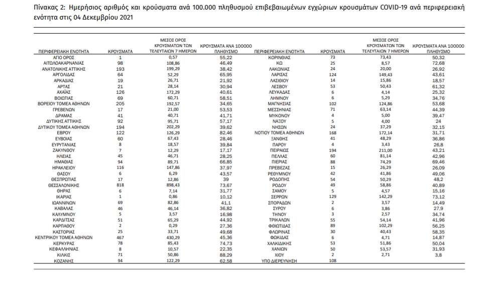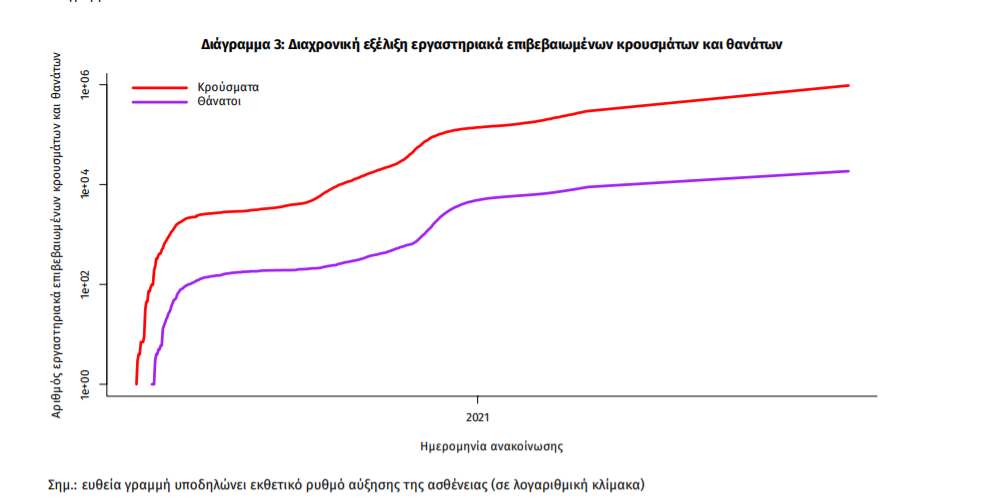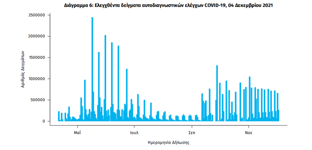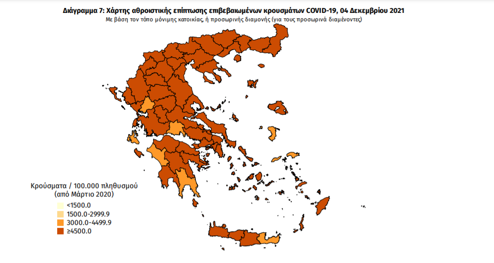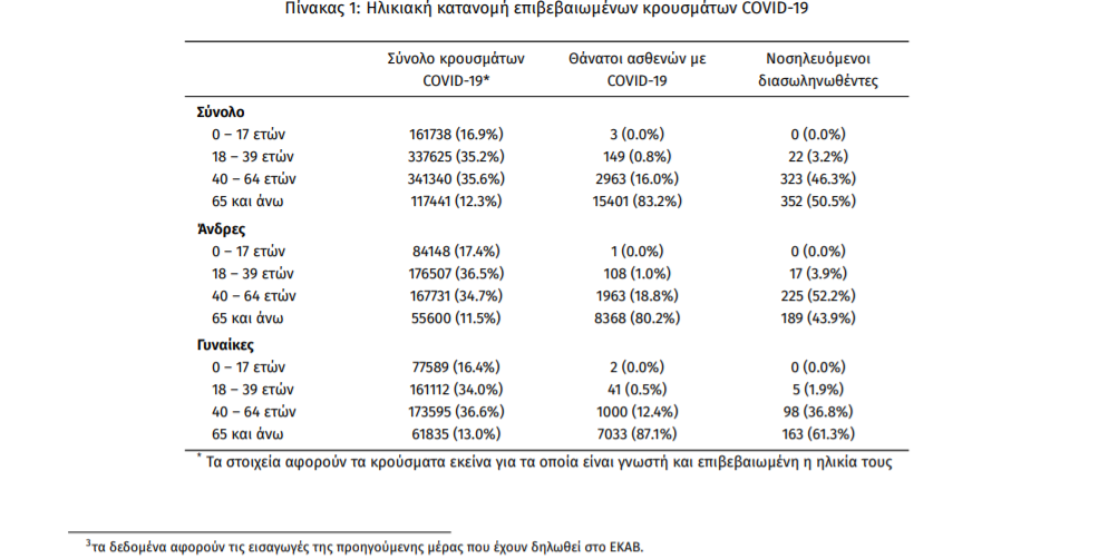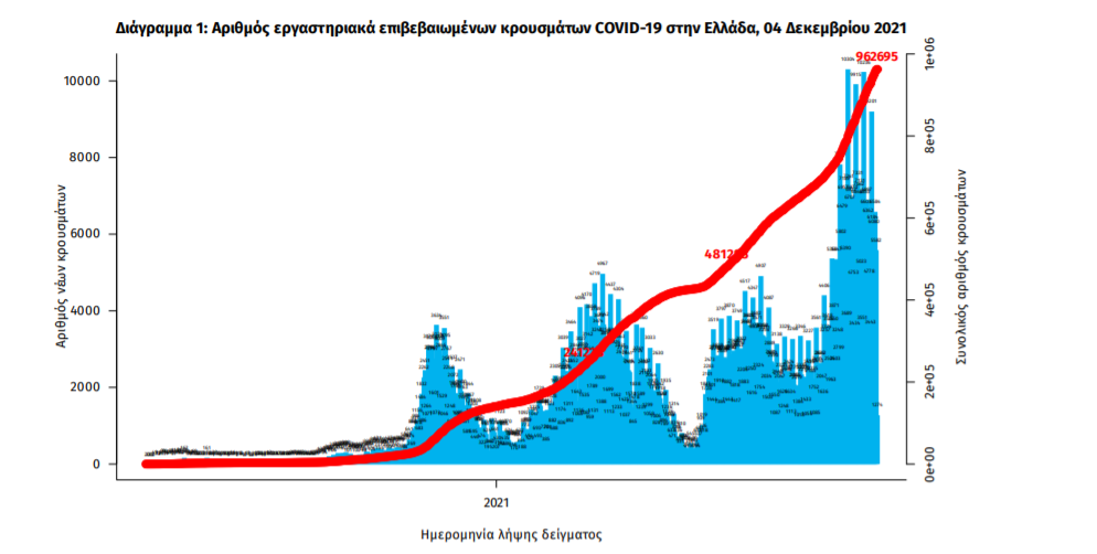 Τα νέα εργαστηριακά επιβεβαιωμένα κρούσματα της νόσου που καταγράφηκαν τις τελευταίες 24 ώρες είναι 5.157 , εκ των οποίων 11 εντοπίστηκαν κατόπιν ελέγχων στις πύλες εισόδου της χώρας. Ο συνολικός αριθμός των κρουσμάτων ανέρχεται σε 962.695 (ημερήσια μεταβολή +0.5%), εκ των οποίων 50.6% άνδρες. 1 Με βάση τα επιβεβαιωμένα κρούσματα των τελευταίων 7 ημερών, 99 θεωρούνται σχετιζόμενα με ταξίδι από το εξωτερικό και 3.290 είναι σχετιζόμενα με ήδη γνωστό κρούσμα.