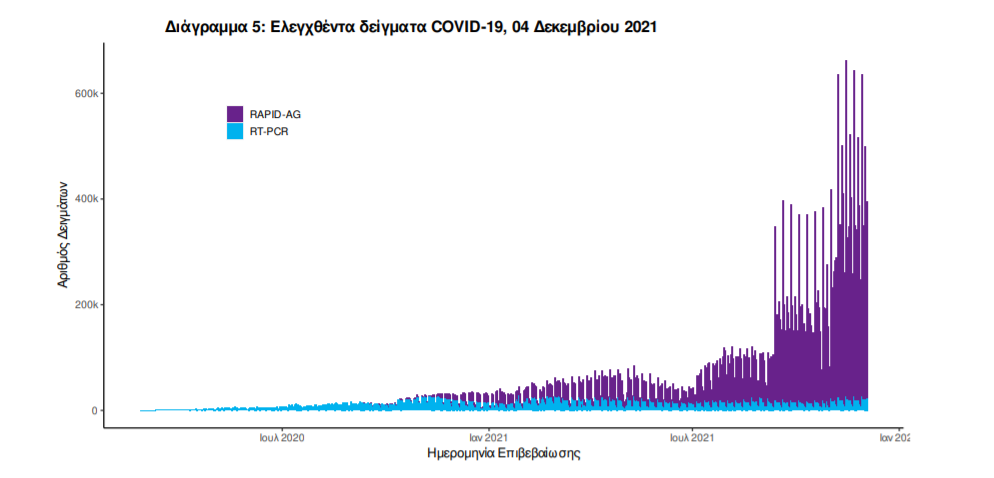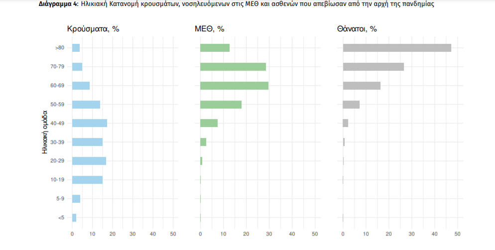 Ο αριθμός των ασθενών που νοσηλεύονται διασωληνωμένοι είναι 697 (61.5% άνδρες). Η διάμεση ηλικία τους είναι 65 έτη. To 80.8% έχει υποκείμενο νόσημα ή/και ηλικία 70 ετών και άνω. Μεταξύ των ασθενών που νοσηλεύονται διασωληνωμένοι, 555 (79.63%) είναι ανεμβολίαστοι ή μερικώς εμβολιασμένοι και 142 (20.37%) είναι πλήρως εμβολιασμένοι. Από την αρχή της πανδημίας έχουν εξέλθει από τις ΜΕΘ 3.554 ασθενείς. Οι εισαγωγές νέων ασθενών Covid-19 στα νοσοκομεία της επικράτειας είναι 455 (ημερήσια μεταβολή +7.82%). Ο μέσος όρος εισαγωγών του επταημέρου είναι 450 ασθενείς.Η διάμεση ηλικία των κρουσμάτων είναι 38 έτη (εύρος 0.2 έως 106 έτη), ενώ η διάμεση ηλικία των θανόντων είναι 78 έτη (εύρος 0.2 έως 106 έτη).