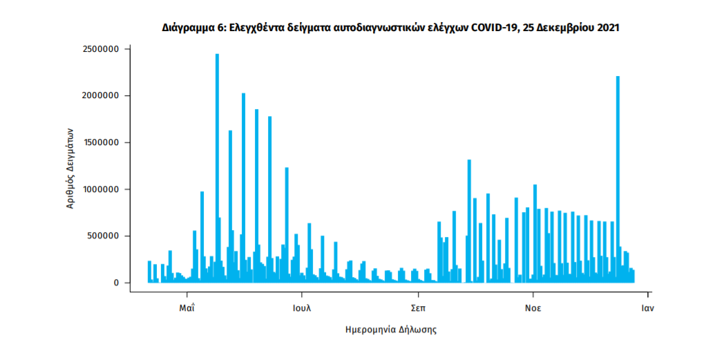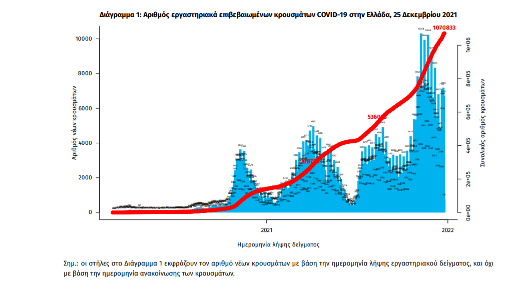 Τα νέα εργαστηριακά επιβεβαιωμένα κρούσματα της νόσου που καταγράφηκαν τις τελευταίες 24 ώρες είναι 6.590 , εκ των οποίων 11 εντοπίστηκαν κατόπιν ελέγχων στις πύλες εισόδου της χώρας. Ο συνολικός αριθμός των κρουσμάτων ανέρχεται σε 1.070.833 (ημερήσια μεταβολή +0.6%), εκ των οποίων 50.4% άνδρες. Με βάση τα επιβεβαιωμένα κρούσματα των τελευταίων 7 ημερών, 213 θεωρούνται σχετιζόμενα με ταξίδι από το εξωτερικό και 2.686 είναι σχετιζόμενα με ήδη γνωστό κρούσμα.