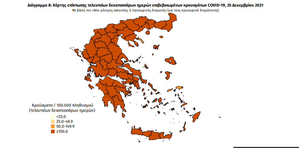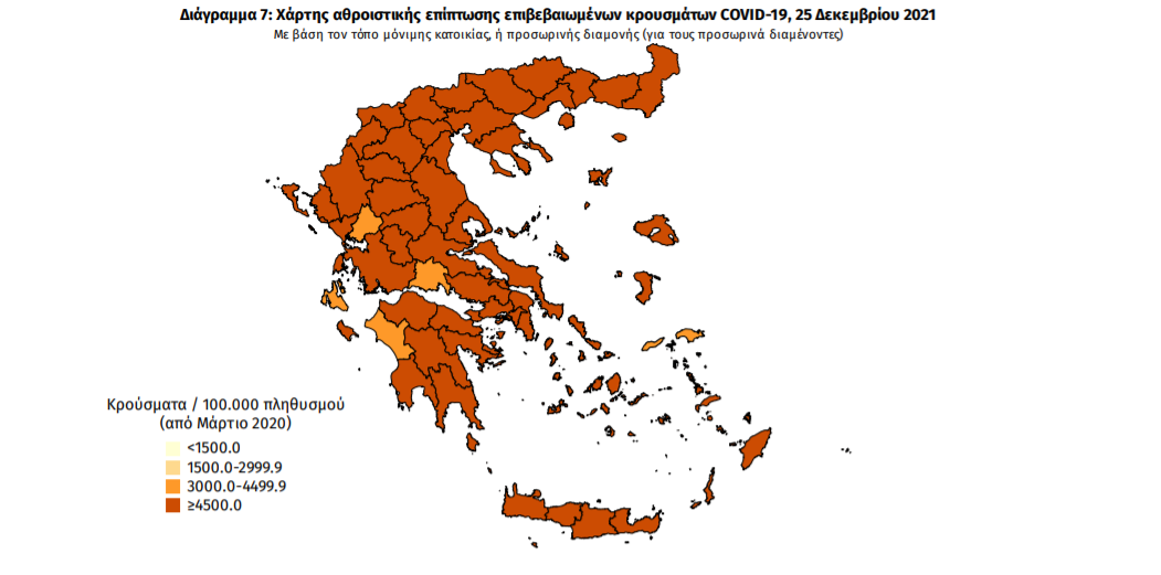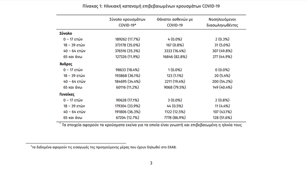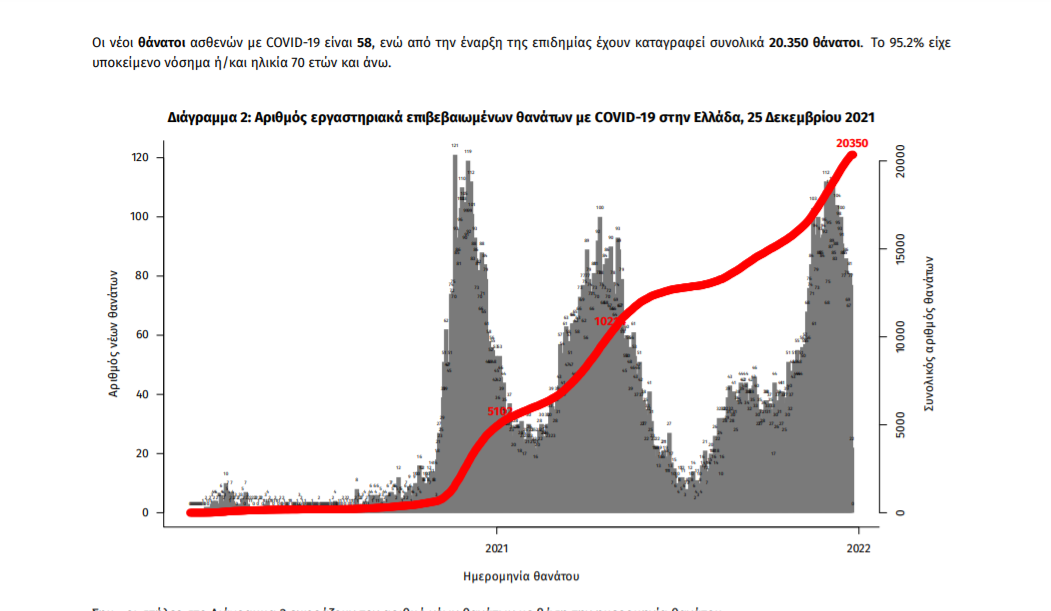 Οι νέοι θάνατοι ασθενών με COVID-19 είναι 58, ενώ από την έναρξη της επιδημίας έχουν καταγραφεί συνολικά 20.350 θάνατοι. Το 95.2% είχε υποκείμενο νόσημα ή/και ηλικία 70 ετών και άνω.