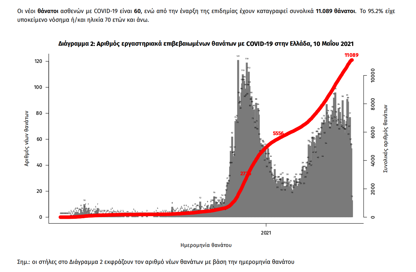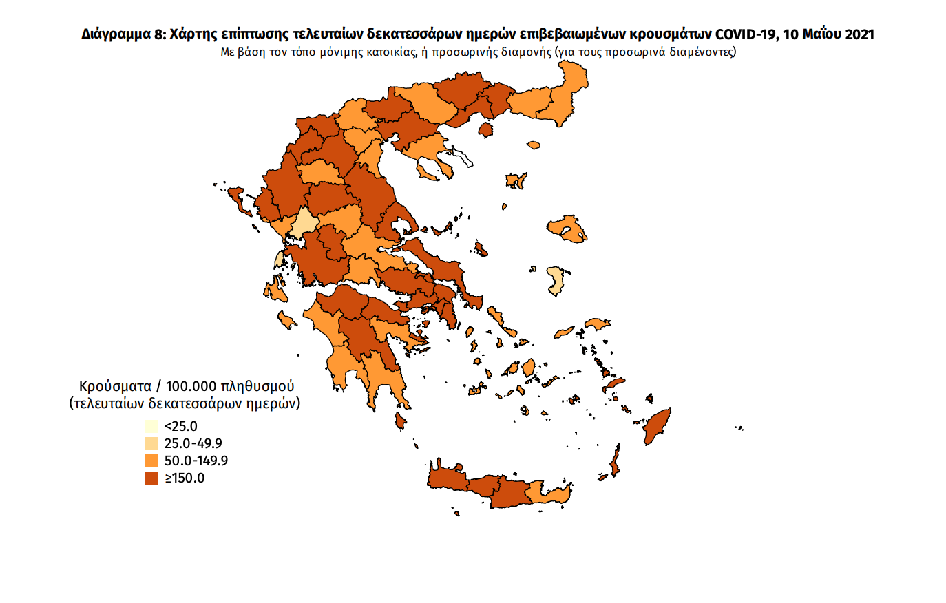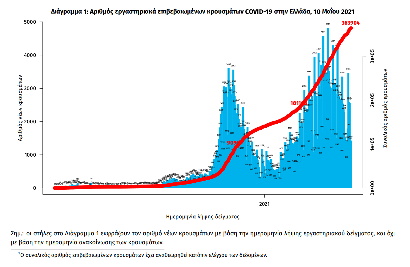 Τα στοιχεία που παρουσιάζονται αφορούν περιστατικά από την επιδημιολογική επιτήρηση της νόσου από το νέο κορωνοϊό (COVID19), με βάση τα δεδομένα που έχουν δηλωθεί στον ΕΟΔΥ και καταγραφεί μέχρι τις 10 Μαΐου 2021 (ώρα 15:00). Τα νέα εργαστηριακά επιβεβαιωμένα κρούσματα της νόσου που καταγράφηκαν τις τελευταίες 24 ώρες είναι 1.904, εκ των οποίων 7 εντοπίστηκαν κατόπιν ελέγχων στις πύλες εισόδου της χώρας.