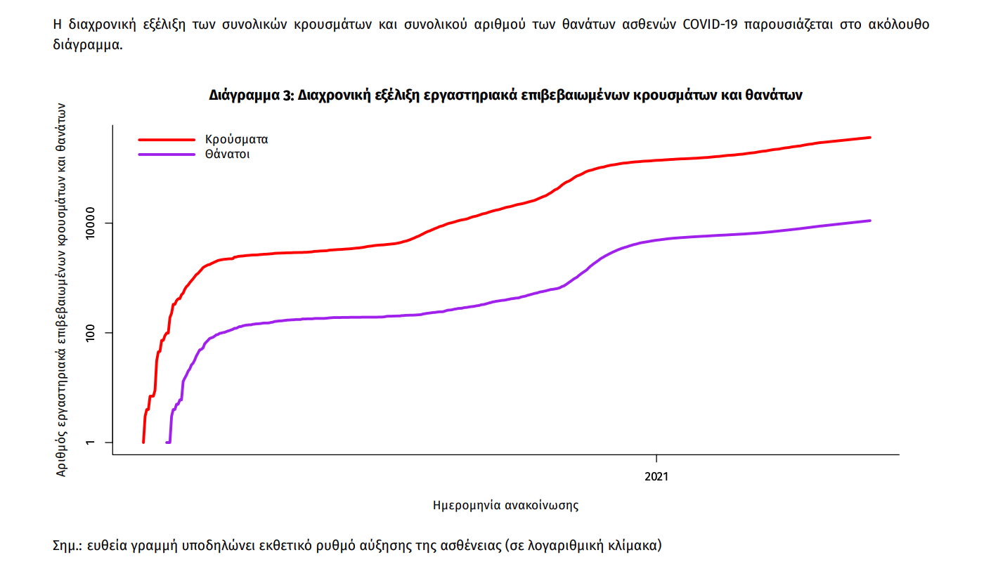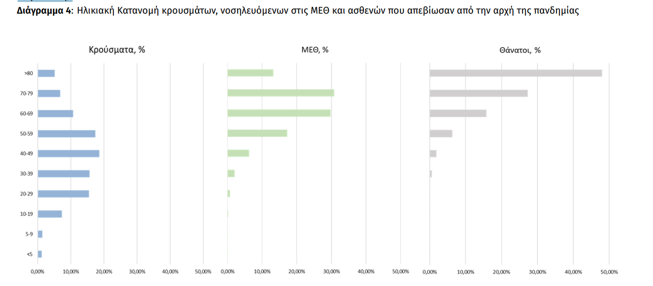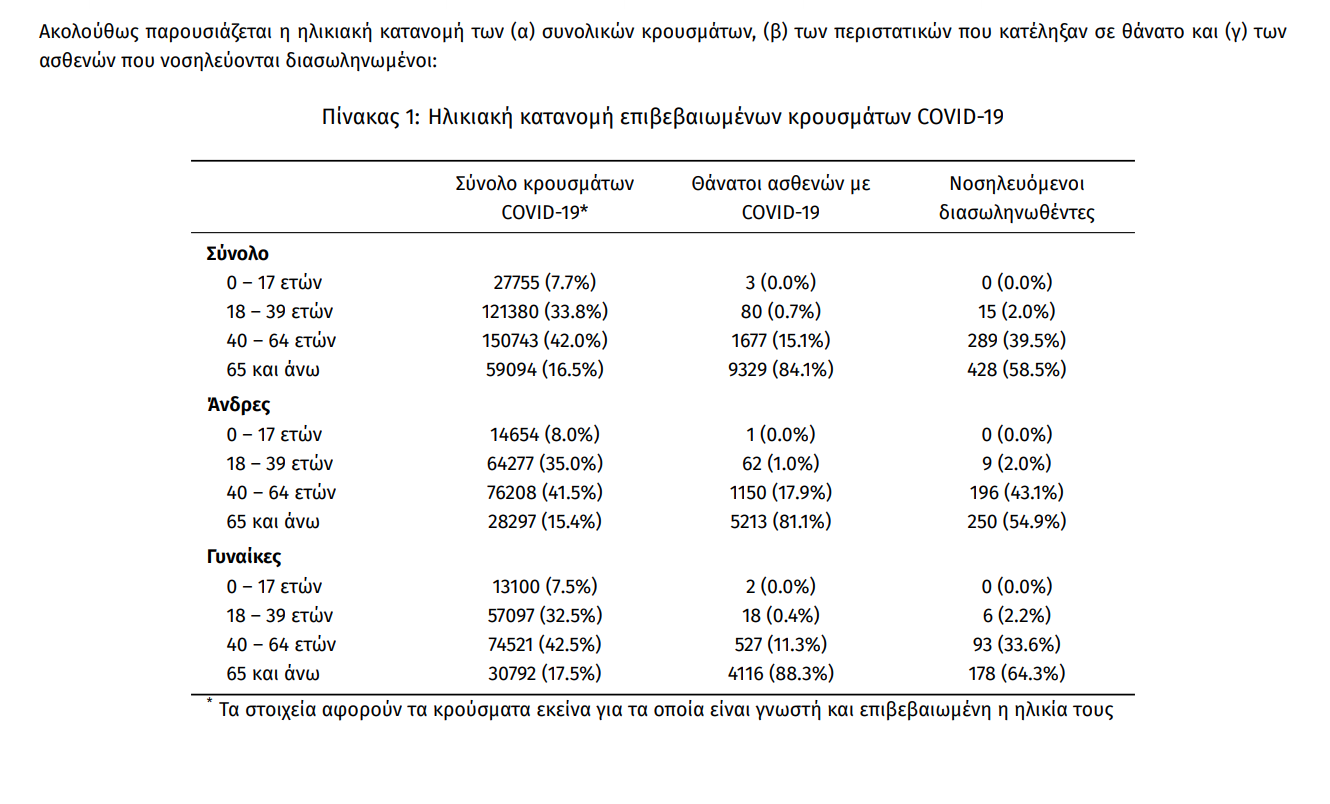 Ο αριθμός των ασθενών που νοσηλεύονται διασωληνωμένοι είναι 732 (62.2% άνδρες). Η διάμεση ηλικία τους είναι 67 έτη. To 82.9% έχει υποκείμενο νόσημα ή/και ηλικία 70 ετών και άνω. Από την αρχή της πανδημίας έχουν εξέλθει από τις ΜΕΘ 2.199 ασθενείς. Οι εισαγωγές2 νέων ασθενών Covid-19 στα νοσοκομεία της επικράτειας είναι 383 (ημερήσια μεταβολή +3.51%). Ο μέσος όρος εισαγωγών του επταημέρου είναι 377 ασθενείς.Η διάμεση ηλικία των κρουσμάτων είναι 44 έτη (εύρος 0.2 έως 106 έτη), ενώ η διάμεση ηλικία των θανόντων είναι 78 έτη (εύρος 0.2 έως 106 έτη).