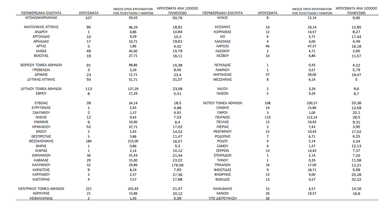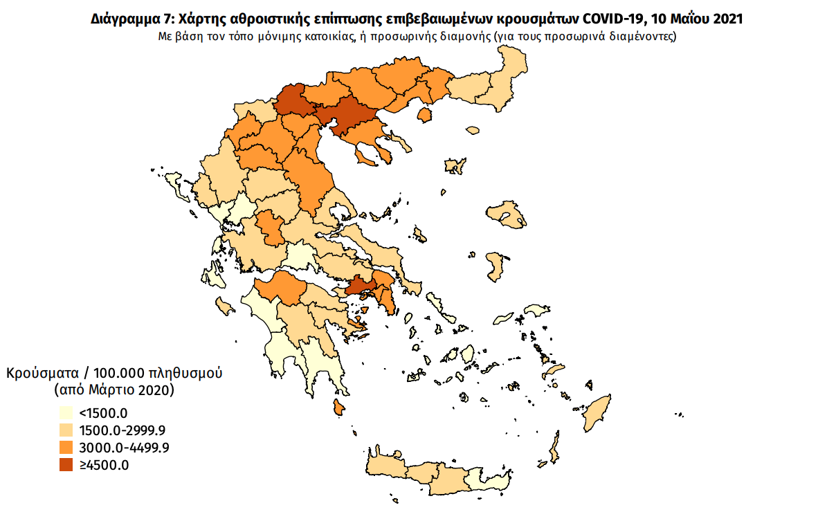 Γεωγραφική διασπορά: Ο χάρτης αποτυπώνει τη γεωγραφική κατανομή των συνολικών κρουσμάτων COVID-19 (από την αρχή της επιδημίας) ανά Περιφερειακή Ενότητα της χώρας, με βάση την δηλωθείσα διεύθυνση μόνιμης κατοικίας του ασθενούς, ή τη διεύθυνση προσωρινής διαμονής για τους τουρίστες και άλλους προσωρινά διαμένοντες στην Ελλάδα. Συμπεριλαμβάνονται τόσο κρούσματα με ιστορικό ταξιδίου (“εισαγόμενα”) όσο και κρούσματα με πιθανή εγχώρια μετάδοση.