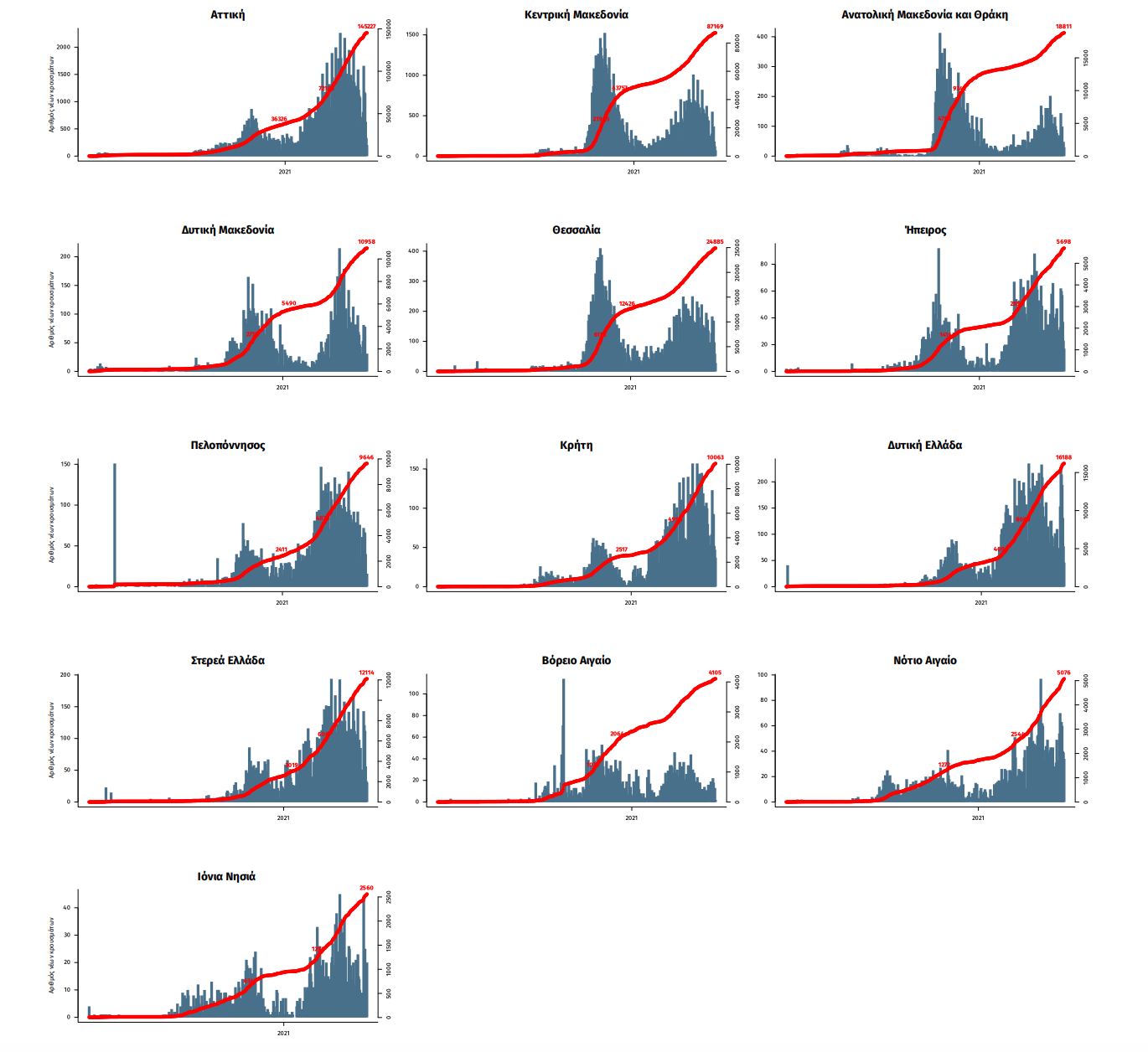 Παράρτημα 1: Επιδημικές καμπύλες κρουσμάτων COVID-19 με βάση την δηλωθείσα διεύθυνση μόνιμης κατοικίας του κρούσματος ή τη διεύθυνση προσωρινής διαμονής για τους τουρίστες και άλλους προσωρινά διαμένοντες στην Ελλάδα. Συμπεριλαμβάνονται τόσο κρούσματα με ιστορικό ταξιδίου όσο και κρούσματα με πιθανή εγχώρια μετάδοση.