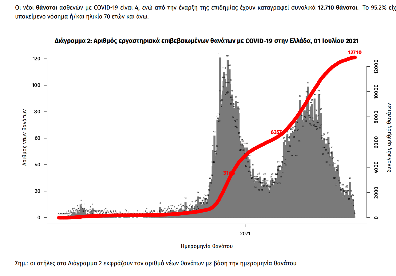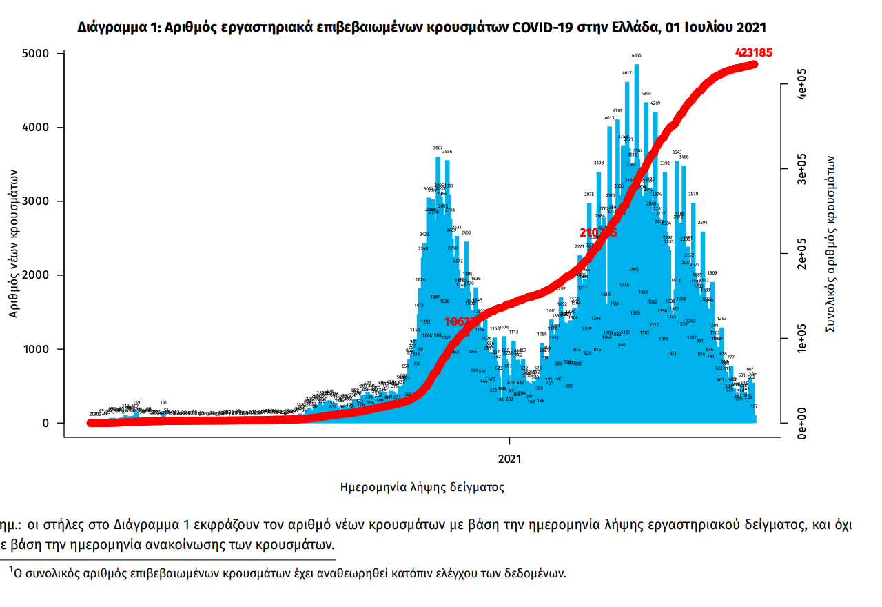 Τα στοιχεία που παρουσιάζονται αφορούν περιστατικά από την επιδημιολογική επιτήρηση της νόσου από το νέο κορωνοϊό (COVID19), με βάση τα δεδομένα που έχουν δηλωθεί στον ΕΟΔΥ και καταγραφεί μέχρι τις 01 Ιουλίου 2021 (ώρα 15:00). Τα νέα εργαστηριακά επιβεβαιωμένα κρούσματα της νόσου που καταγράφηκαν τις τελευταίες 24 ώρες είναι 761, εκ των οποίων 1 εντοπίστηκε κατόπιν ελέγχων στις πύλες εισόδου της χώρας.