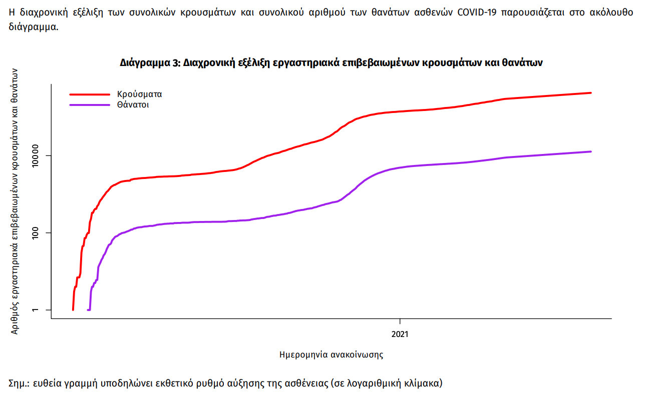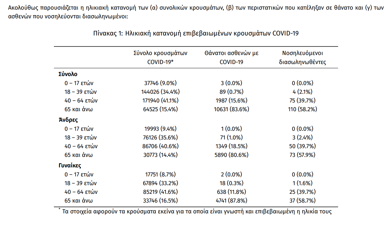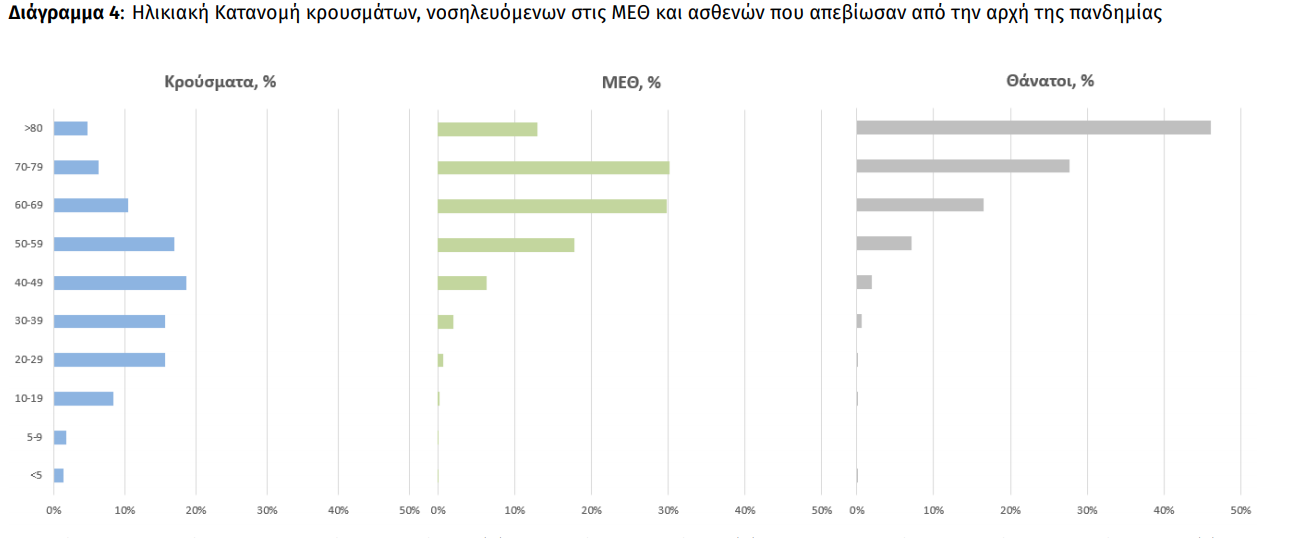 Ο αριθμός των ασθενών που νοσηλεύονται διασωληνωμένοι είναι 189 (66.7% άνδρες). Η διάμεση ηλικία τους είναι 67 έτη. To 84.1% έχει υποκείμενο νόσημα ή/και ηλικία 70 ετών και άνω. Από την αρχή της πανδημίας έχουν εξέλθει από τις ΜΕΘ 2.689 ασθενείς. Οι εισαγωγές2 νέων ασθενών Covid-19 στα νοσοκομεία της επικράτειας είναι 38 (ημερήσια μεταβολή +2.7%). Ο μέσος όρος εισαγωγών του επταημέρου είναι 41 ασθενείς.Η διάμεση ηλικία των κρουσμάτων είναι 43 έτη (εύρος 0.2 έως 106 έτη), ενώ η διάμεση ηλικία των θανόντων είναι 78 έτη (εύρος 0.2 έως 106 έτη).