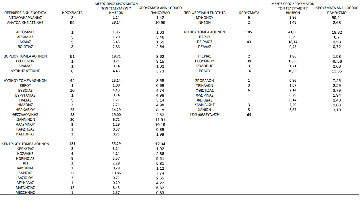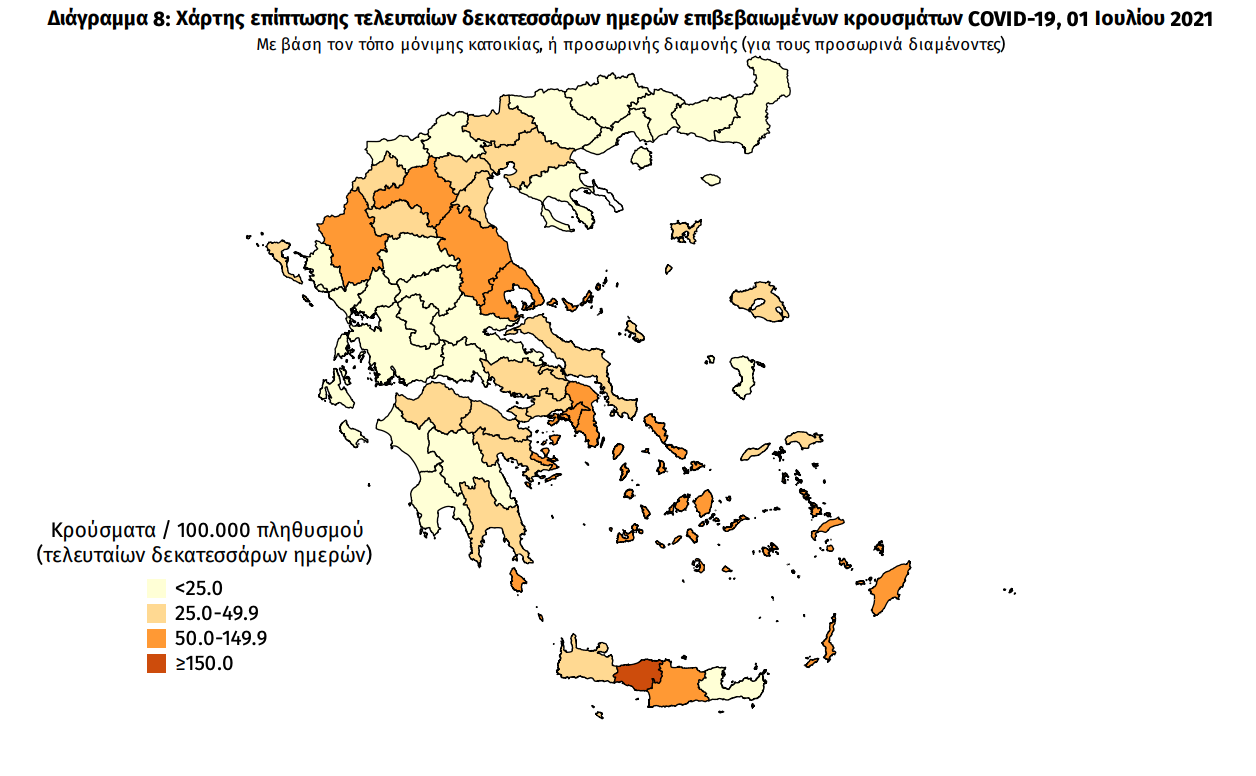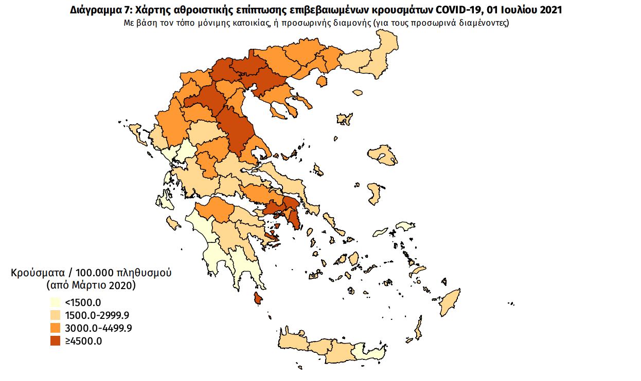 Γεωγραφική διασπορά: Ο χάρτης αποτυπώνει τη γεωγραφική κατανομή των συνολικών κρουσμάτων COVID-19 (από την αρχή της επιδημίας) ανά Περιφερειακή Ενότητα της χώρας, με βάση την δηλωθείσα διεύθυνση μόνιμης κατοικίας του ασθενούς, ή τη διεύθυνση προσωρινής διαμονής για τους τουρίστες και άλλους προσωρινά διαμένοντες στην Ελλάδα. Συμπεριλαμβάνονται τόσο κρούσματα με ιστορικό ταξιδίου (“εισαγόμενα”) όσο και κρούσματα με πιθανή εγχώρια μετάδοση.
