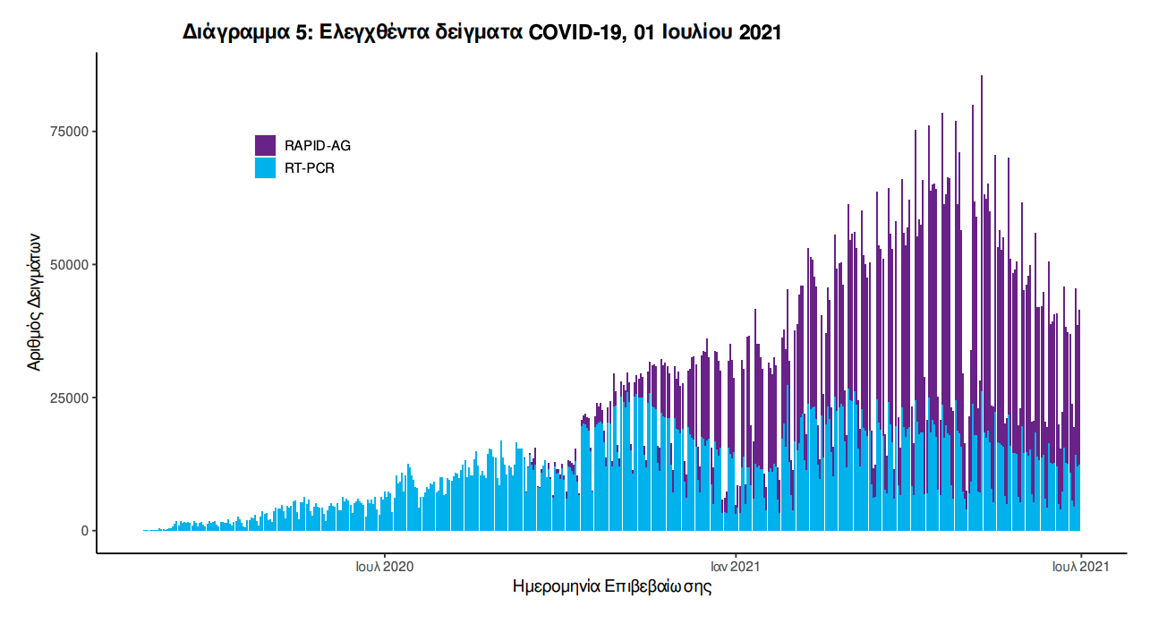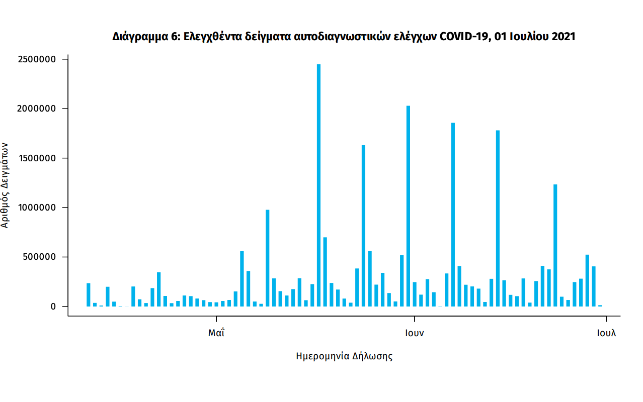 Δείγματα που έχουν ελεγχθεί: Από την 1η Ιανουαρίου 2020 μέχρι σήμερα, στα εργαστήρια που διενεργούν ελέγχους για τον νέο κορωνοϊό (SARS-CoV-2) και που δηλώνουν συστηματικά το σύνολο των δειγμάτων που ελέγχουν, έχουν συνολικά ελεγχθεί 5.426.448 κλινικά δείγματα ενώ από Μονάδες Υγείας και Κλιμάκια του ΕΟΔΥ που διενεργούν ελέγχους Rapid Ag έχουν ελεγχθεί 5.247.558 δείγματα. O μέσος όρος του επταημέρου είναι 34.733 δειγματοληπτικοί έλεγχοι. Αυτοδιαγνωστικοί έλεγχοι (Self-tests): Έως 30 Ιουνίου 2021, έχουν καταγραφεί ηλεκτρονικά 25.919.818 δηλώσεις αποτελέσματος αυτοδιαγνωστικού ελέγχου, ενώ 474.929 άτομα προσήλθαν για επανέλεγχο. Mαζικές Δειγματοληψίες ΕΟΔΥ: Στις 30 Ιουνίου 2021, πραγματοποιήθηκαν 133 δράσεις δειγματοληπτικών ελέγχων από τις Κινητές Ομάδες Υγείας (ΚΟΜΥ) του ΕΟΔΥ, στις οποίες διενεργήθηκαν 8.321 έλεγχοι Rapid Ag και ανευρέθηκαν 113 θετικά (1,36%).