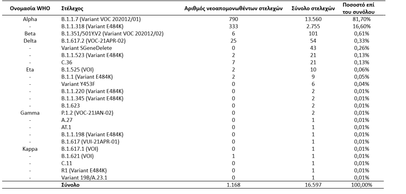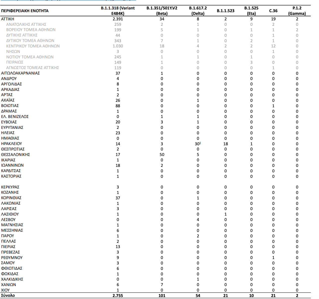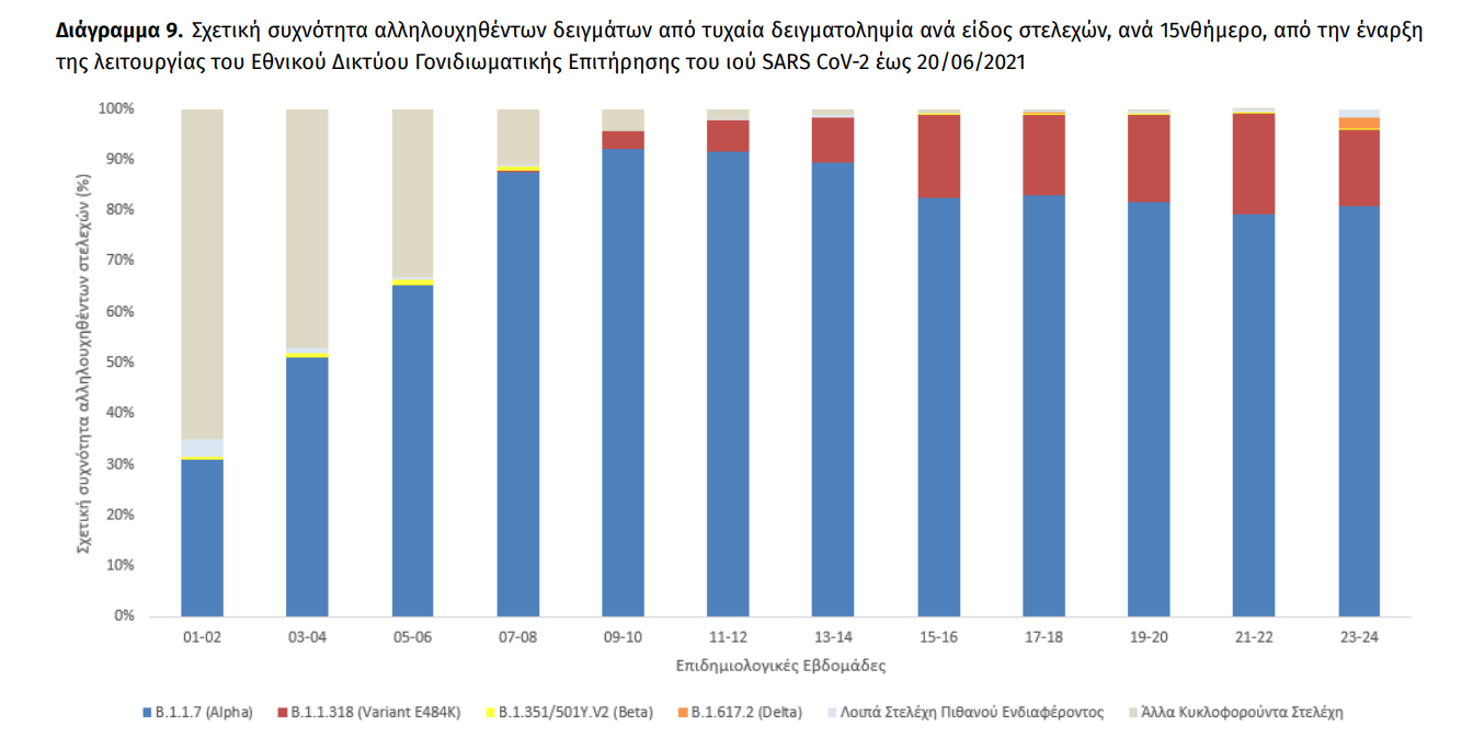 Eθνικό Δίκτυο Γονιδιωματικής Επιτήρησης ΕΟΔΥ για τις μεταλλάξεις του SARS-CoV-2 Ολοκληρώθηκε από το Eθνικό Δίκτυο Γονιδιωματικής Επιτήρησης του ιού SARS-CoV-2, που λειτουργεί υπό το συντονισμό του ΕΟΔΥ, η γονιδιωματική ανάλυση σε 1.201 δείγματα που έχουν επιλεγεί τυχαιοποιημένα ή στοχευμένα και αφορούν στην περίοδο 31 Μαρτίου 2021 έως 21 Ιουνίου 2021. Από τον έλεγχο των 1.201 δειγμάτων, αναδείχθηκαν συνολικά 821 δείγματα με στελέχη ειδικού ενδιαφέροντος (Variants Of Concern – VOC), 340 δείγματα με στελέχη υπό παρακολούθηση (Variants Under Monitoring) και 3 δείγματα με στελέχη ενδιαφέροντος (Variant of Interest – VOI). Εκ των 821 δειγμάτων με στελέχη ειδικού ενδιαφέροντος, τα 790 αφορούν στο στέλεχος Alpha, 6 αφορούν στο Βeta και 25 αφορούν στο Delta. Εκ των 340 δειγμάτων με στελέχη υπό παρακολούθηση, τα 333 αφορούν στο στέλεχος B.1.1.318 (Variant E484K), και 7 αφορούν στο C.36. Εκ των 3 δειγμάτων με στελέχη ενδιαφέροντος, 2 αφορούν στο στέλεχος Eta και 1 δείγμα αφορά στο B.1.621. Επιπλέον, ανιχνεύθηκαν 2 στελέχη B.1.1.523 (Variant E484K) και 2 Β.1.1 (Variant E484K) (Πίνακας 3). Από την έναρξη λειτουργίας του Εθνικού Δικτύου Γονιδιωματικής Επιτήρησης του ιού SARS-CoV-2 μέχρι σήμερα έχουν ελεγχθεί στην επικράτεια συνολικά 19.544 δείγματα από εγχώρια κρούσματα. Εξ αυτών 17.073 προέρχονται από τυχαία επιλογή δειγμάτων, 1.763 προέρχονται από στοχευμένη λήψη ή επιλογή δειγμάτων και για 708 δείγματα δεν είναι διαθέσιμος ο τρόπος επιλογής. Μεταξύ των 17.073 τυχαία επιλεγμένων δειγμάτων στην επικράτεια, τα τρία πιο συχνά στελέχη ειδικού ενδιαφέροντος ή υπό παρακολούθηση που έχουν απομονωθεί είναι το Alpha, με ποσοστό 77,48%, ακολουθούμενο από το B.1.1.318 (Variant E484K) με ποσοστό 9,78% και το Beta με ποσοστό 0,29% (Πίνακας 4). Η διαχρονική εξέλιξη της σχετικής συχνότητας των αλληλουχηθέντων δειγμάτων από τυχαία δειγματοληψία ανά είδος στελεχών, μέχρι και την εβδομάδα 24 απεικονίζεται στο Διάγραμμα 9. Από τα 1.763 δείγματα που έχουν ληφθεί ή επιλεγεί στοχευμένα, έχουν βρεθεί 1.600 στελέχη ειδικού ενδιαφέροντος ή υπό παρακολούθηση. Από τα δείγματα αυτά, 21,89% αφορούν στο στέλεχος Alpha, 63,41% στο B.1.1.318 (Variant E484K), 3,18% στο Beta, 1,99% στο Delta και 0,28% στο C.36. Επιπλέον, έχουν απομονωθεί συνολικά 122 στελέχη ειδικού ενδιαφέροντος ή υπό παρακολούθηση ή ενδιαφέροντος από δείγματα εισαγόμενων κρουσμάτων, εκ των οποίων 106 στο Alpha, 4 στο Beta, 5 στο Delta, 4 στο Β.1.1.318 (Variant E484K), 1 στο Eta, 1 στο Kappa και 1 στο B.1.621 (VOI). Όσον αφορά στα στελέχη ενδιαφέροντος που χρήζουν άμεσης λήψης μέτρων ελέγχου επί του παρόντος στη χώρα, η γεωγραφική κατανομή ανά Περιφερειακή Ενότητα παρουσιάζεται στον πίνακα 5. Πίνακας 3*¥. Απόλυτη και σχετική συχνότητα στελεχών ειδικού ενδιαφέροντος/υπό διερεύνηση/υπό παρακολούθηση ή άλλα στελέχη ενδιαφέροντος του ιού SARS CoV-2 από την έναρξη λειτουργίας του Εθνικού Δικτύου Γονιδιωματικής Επιτήρησης του ιού SARS-CoV-2 μέχρι σήμερα