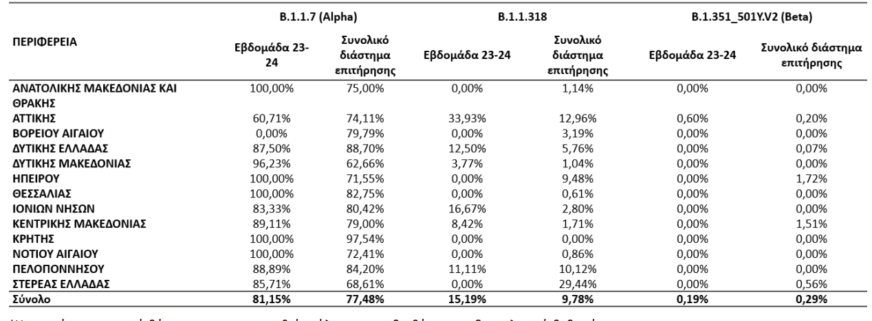 *Η παρούσα κατανομή δύναται να τροποποιηθεί ανάλογα με τα διαθέσιμα επιδημιολογικά δεδομένα ¥Καθώς η διαδικασία τυποποιημένης ονοματολογίας των στελεχών ενδιαφέροντος είναι σε εξέλιξη παγκοσμίως, η ονομασία τους είναι δυνατό να τροποποιείται στο χρόνο. Σημ. Τα ποσοστά για τις εβδομάδες 23-24 που αντιστοιχούν στις Περιφέρειες Ανατολικής Μακεδονίας και Θράκης, Βορείου Αιγαίου, Δυτικής Ελλάδας, Ηπείρου, Θεσσαλίας, Ιονίων Νήσων, Νοτίου Αιγαίου, Πελοποννήσου και Στερεάς Ελλάδας έχουν υπολογιστεί επί συνόλου δειγμάτων
