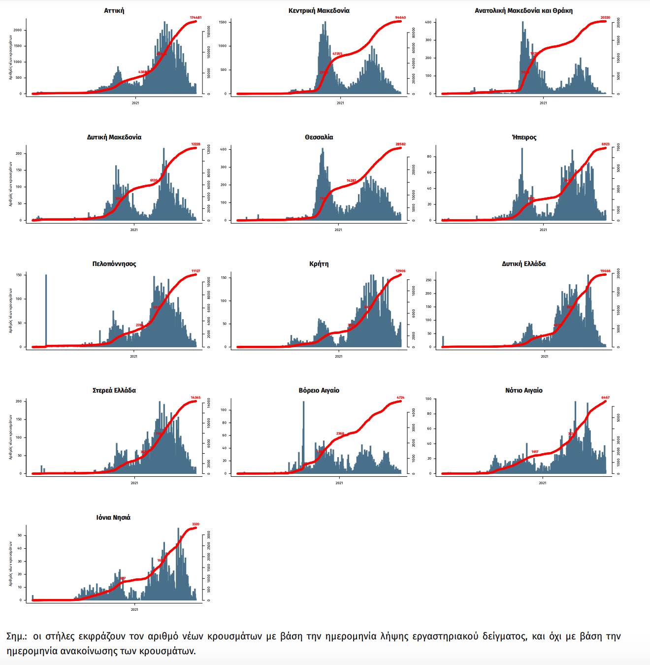 Παράρτημα 1: Επιδημικές καμπύλες κρουσμάτων COVID-19 με βάση την δηλωθείσα διεύθυνση μόνιμης κατοικίας του κρούσματος ή τη διεύθυνση προσωρινής διαμονής για τους τουρίστες και άλλους προσωρινά διαμένοντες στην Ελλάδα. Συμπεριλαμβάνονται τόσο κρούσματα με ιστορικό ταξιδίου όσο και κρούσματα με πιθανή εγχώρια μετάδοση.