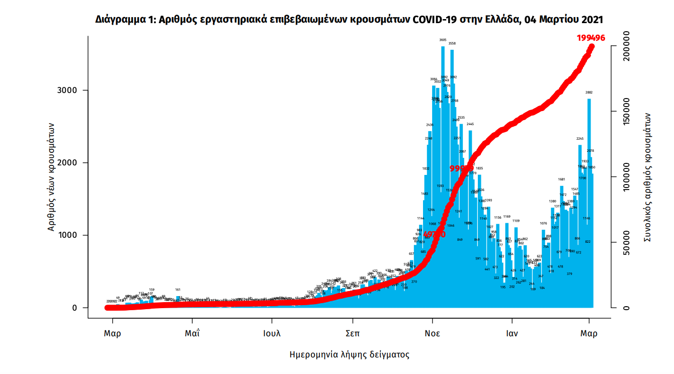 Τα στοιχεία που παρουσιάζονται αφορούν περιστατικά από την επιδημιολογική επιτήρηση της νόσου από το νέο κορωνοϊό (COVID19), με βάση τα δεδομένα που έχουν δηλωθεί στον ΕΟΔΥ και καταγραφεί μέχρι τις 04 Μαρτίου 2021 (ώρα 15:00). Τα νέα εργαστηριακά επιβεβαιωμένα κρούσματα της νόσου που καταγράφηκαν τις τελευταίες 24 ώρες είναι 2.219, εκ των οποίων 21 εντοπίστηκαν κατόπιν ελέγχων στις πύλες εισόδου της χώρας. Ο συνολικός αριθμός των κρουσμάτων ανέρχεται σε 199.496 (ημερήσια μεταβολή +1.1%), εκ των οποίων 51.7% άνδρες. 1 Με βάση τα επιβεβαιωμένα κρούσματα των τελευταίων 7 ημερών, 70 θεωρούνται σχετιζόμενα με ταξίδι από το εξωτερικό και 2.695 είναι σχετιζόμενα με ήδη γνωστό κρούσμα. Ημερήσια εξέλιξη της πανδημίας: Η ημερήσια κατανομή των επιβεβαιωμένων κρουσμάτων είναι η ακόλουθη (η γραμμή παριστάνει την συνολική, αθροιστική κατανομή των κρουσμάτων).