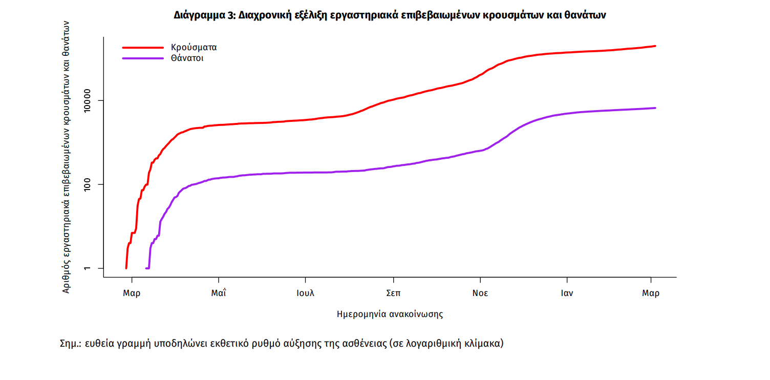 Η διαχρονική εξέλιξη των συνολικών κρουσμάτων και συνολικού αριθμού των θανάτων ασθενών COVID-19 παρουσιάζεται στο ακόλουθο διάγραμμα.