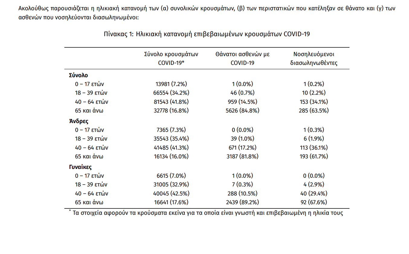 Ο αριθμός των ασθενών που νοσηλεύονται διασωληνωμένοι είναι 449 (69.5% άνδρες). Η διάμεση ηλικία τους είναι 68 έτη. To 85.1% έχει υποκείμενο νόσημα ή/και ηλικία 70 ετών και άνω. Από την αρχή της πανδημίας έχουν εξέλθει από τις ΜΕΘ 1.389 ασθενείς. Οι εισαγωγές2 νέων ασθενών Covid-19 στα νοσοκομεία της επικράτειας είναι 365 (ημερήσια μεταβολή -7.36%). Ο μέσος όρος εισαγωγών του επταημέρου είναι 316 ασθενείς. Hλικιακή κατανομή: Η διάμεση ηλικία των κρουσμάτων είναι 44 έτη (εύρος 0.2 έως 105 έτη), ενώ η διάμεση ηλικία των θανόντων είναι 79 έτη (εύρος 15 έως 103 έτη).