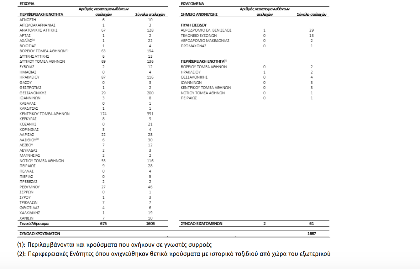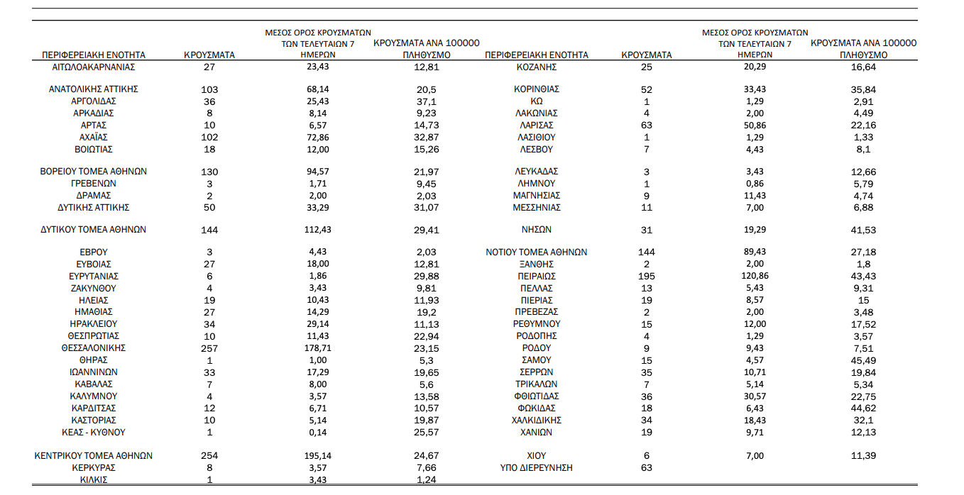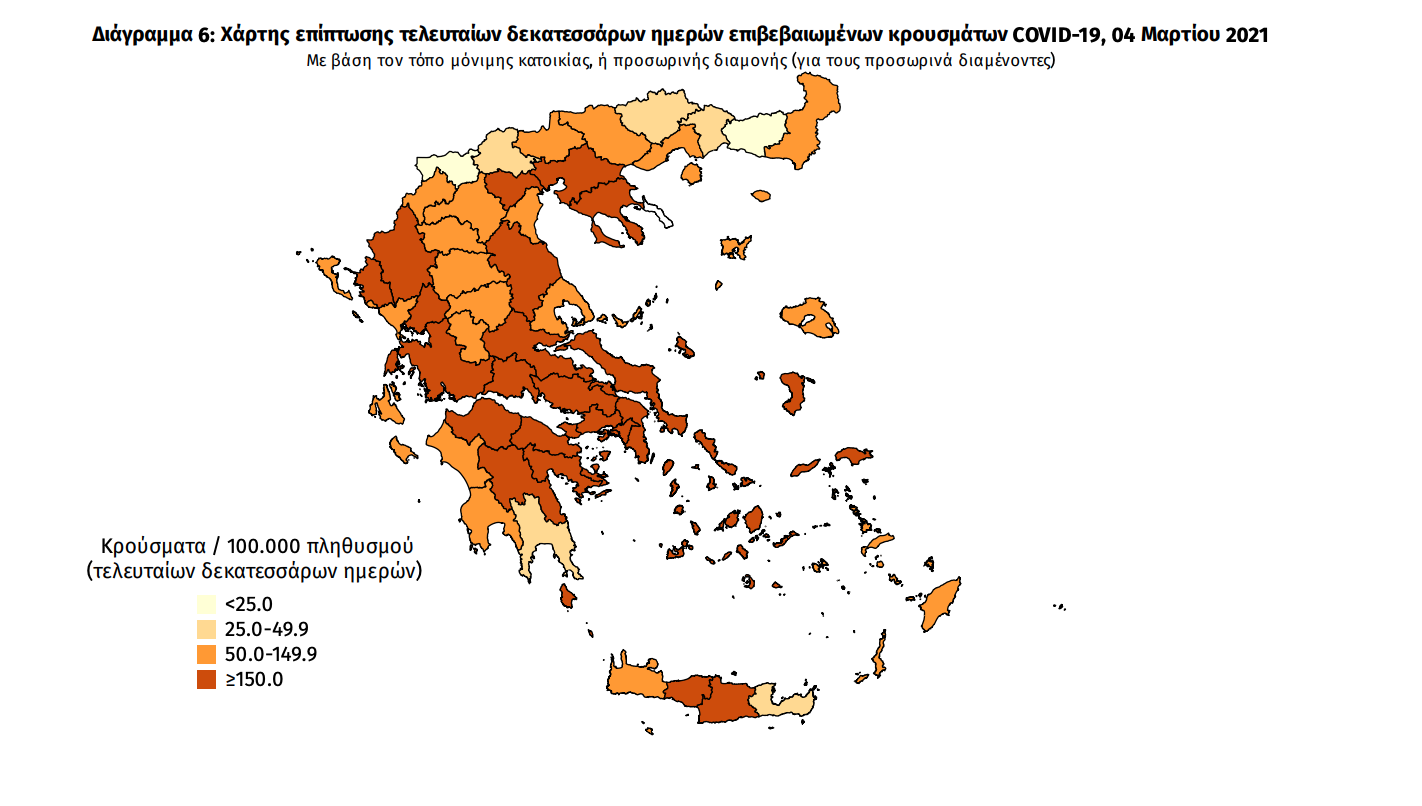 Γεωγραφική διασπορά: Ο χάρτης αποτυπώνει τη γεωγραφική κατανομή των συνολικών κρουσμάτων COVID-19 (από την αρχή της επιδημίας) ανά Περιφερειακή Ενότητα της χώρας, με βάση την δηλωθείσα διεύθυνση μόνιμης κατοικίας του ασθενούς, ή τη διεύθυνση προσωρινής διαμονής για τους τουρίστες και άλλους προσωρινά διαμένοντες στην Ελλάδα. Συμπεριλαμβάνονται τόσο κρούσματα με ιστορικό ταξιδίου (“εισαγόμενα”) όσο και κρούσματα με πιθανή εγχώρια μετάδοση.