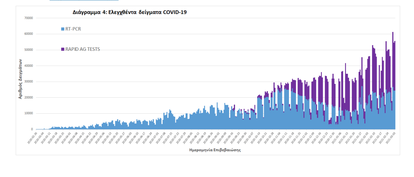 Δείγματα που έχουν ελεγχθεί: Από την 1η Ιανουαρίου 2020 μέχρι σήμερα, στα εργαστήρια που διενεργούν ελέγχους για τον νέο κορωνοϊό (SARS-CoV-2) και που δηλώνουν συστηματικά το σύνολο των δειγμάτων που ελέγχουν, έχουν συνολικά ελεγχθεί 3.735.891 κλινικά δείγματα ενώ από Μονάδες Υγείας και Κλιμάκια του ΕΟΔΥ που διενεργούν ελέγχους Rapid Ag έχουν ελεγχθεί 1.689.417 δείγματα. O μέσος όρος του επταημέρου είναι 44.596 δειγματοληπτικοί έλεγχοι.