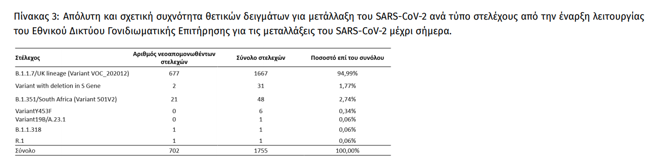 Eθνικό Δίκτυο Γονιδιωματικής Επιτήρησης για τις μεταλλάξεις του SARS-CoV-2 Ολοκληρώθηκε η γονιδιωματική ανάλυση σε 944 επιλεγμένα νέα δείγματα που αφορούν στην περίοδο 22 Ιανουαρίου έως 1 Μαρτίου 2021. Τα δείγματα προέρχονται από τις Περιφέρειες Κεντρικής Μακεδονίας, Ηπείρου, Ιονίων Νήσων, Θεσσαλίας, Κρήτης, Αττικής και τις Περιφερειακές Ενότητες Φθιώτιδας, Βοιωτίας, Εύβοιας, Κορινθίας, Αιτωλοακαρνανίας, Αχαΐας, Μυτιλήνης και Σύρου. Από τον έλεγχο των 944 δειγμάτων, αναδείχθηκαν συνολικά 702 στελέχη με μεταλλάξεις ειδικού ενδιαφέροντος (variants of concern). Από τα 702 στελέχη, τα 677 βρέθηκαν με τη μετάλλαξη Β.1.1.7/UK lineage (Variant VOC_202012) και 21 στελέχη βρέθηκαν με τη μετάλλαξη Lineage B.1.351/South Africa (Variant 501V2) (Πίνακας 3). Συνολικά έχουν ταυτοποιηθεί 1.667 θετικά για την παρουσία μετάλλαξης Β.1.1.7/UK lineage (Variant VOC_202012) (Πίνακας 4) και 48 θετικά για την παρουσία μετάλλαξης B.1.351/South Africa (Variant 501V2) από την έναρξη λειτουργίας του Εθνικού Δικτύου Γονιδιωματικής Επιτήρησης για τις μεταλλάξεις του SARS- CoV-2 έως σήμερα. Τα 48 θετικά για την παρουσία μετάλλαξης Lineage B.1.351/South Africa (Variant 501V2) είναι όλα εγχώρια, εκ των οποίων 41 προέρχονται από την Περιφερειακή Ενότητα Θεσσαλονίκης, 2 από την Περιφερειακή Ενότητα Ιωαννίνων και 5 από την Περιφέρεια Αττικής.