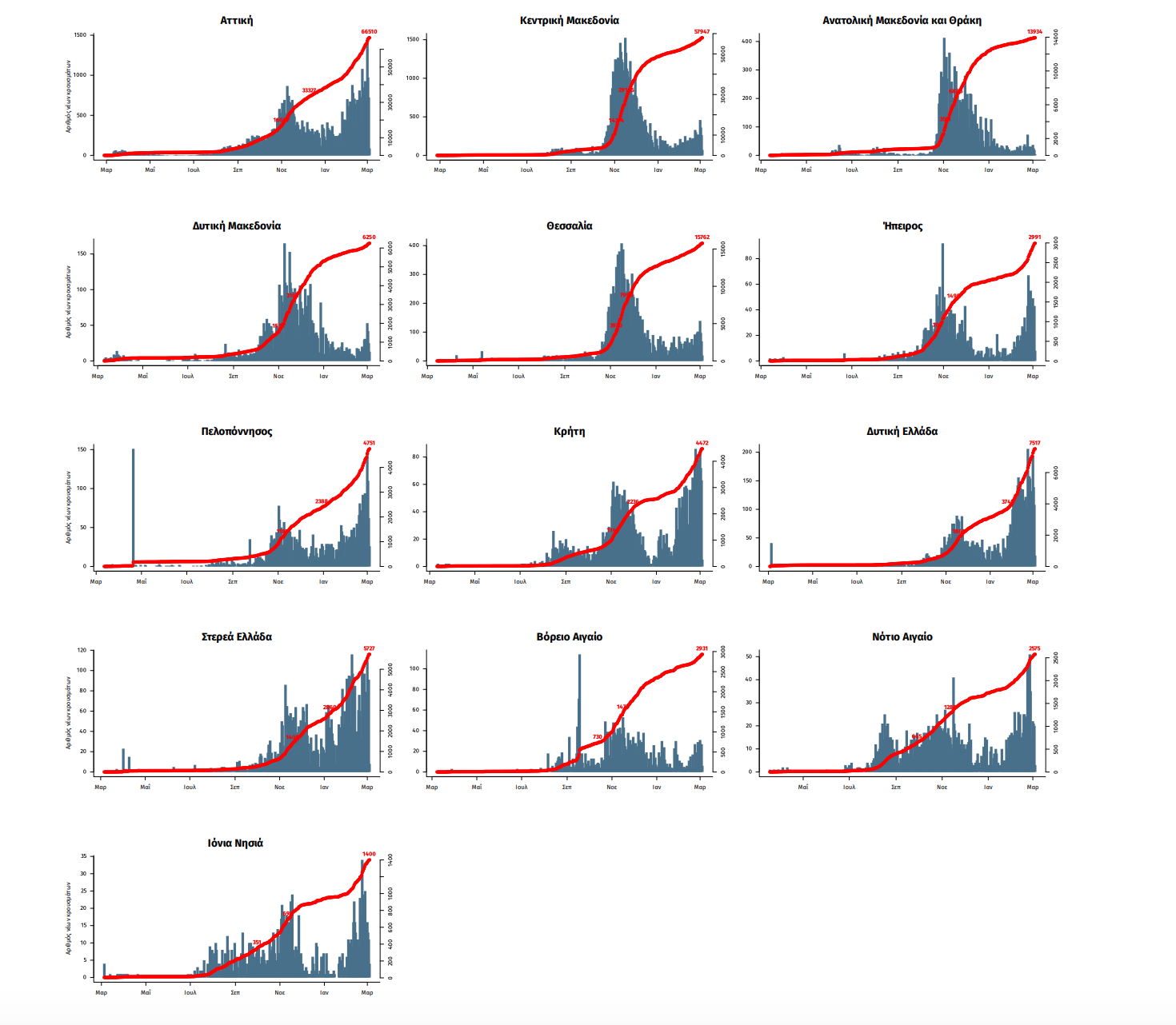 Παράρτημα 1: Επιδημικές καμπύλες κρουσμάτων COVID-19 με βάση την δηλωθείσα διεύθυνση μόνιμης κατοικίας του κρούσματος ή τη διεύθυνση προσωρινής διαμονής για τους τουρίστες και άλλους προσωρινά διαμένοντες στην Ελλάδα. Συμπεριλαμβάνονται τόσο κρούσματα με ιστορικό ταξιδίου όσο και κρούσματα με πιθανή εγχώρια μετάδοση.