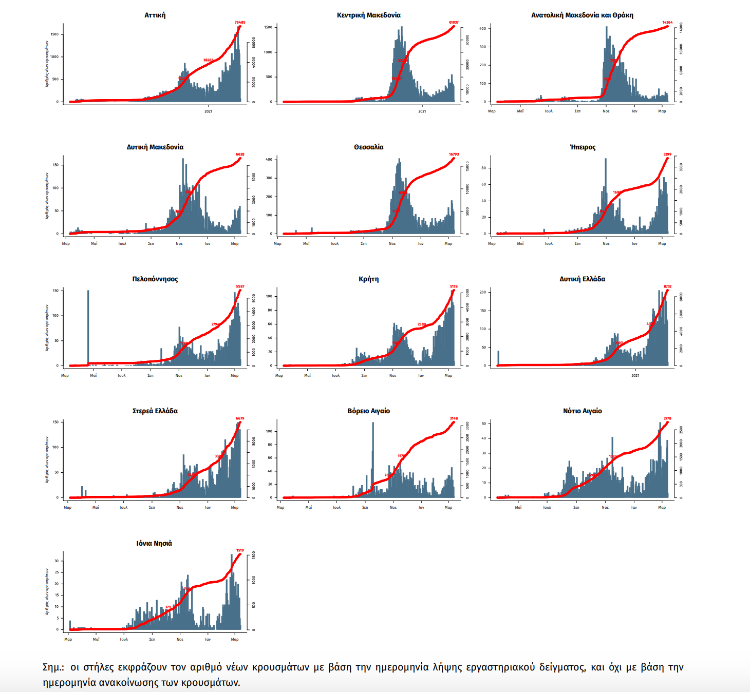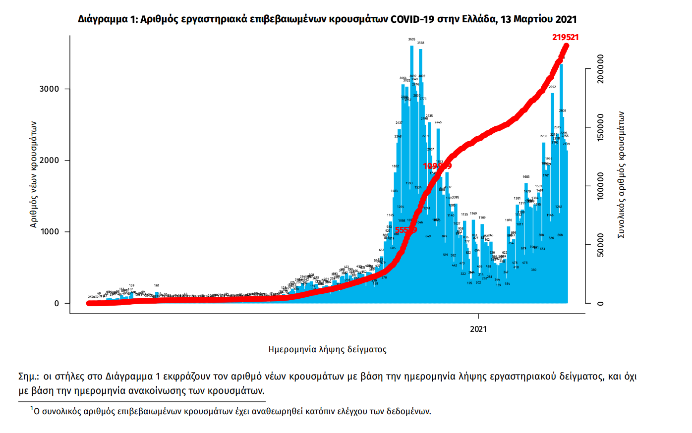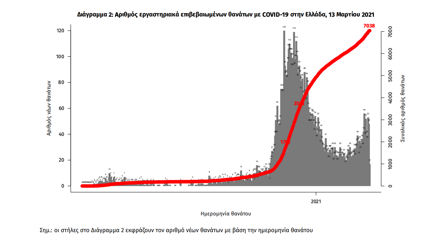 Τα στοιχεία που παρουσιάζονται αφορούν περιστατικά από την επιδημιολογική επιτήρηση της νόσου από το νέο κορωνοϊό (COVID19), με βάση τα δεδομένα που έχουν δηλωθεί στον ΕΟΔΥ και καταγραφεί μέχρι τις 13 Μαρτίου 2021 (ώρα 15:00). Τα νέα εργαστηριακά επιβεβαιωμένα κρούσματα της νόσου που καταγράφηκαν τις τελευταίες 24 ώρες είναι 2.512, εκ των οποίων 7 εντοπίστηκαν κατόπιν ελέγχων στις πύλες εισόδου της χώρας. Ο συνολικός αριθμός των κρουσμάτων ανέρχεται σε 219.521 (ημερήσια μεταβολή +1.2%), εκ των οποίων 51.6% άνδρες. 1 Με βάση τα επιβεβαιωμένα κρούσματα των τελευταίων 7 ημερών, 57 θεωρούνται σχετιζόμενα με ταξίδι από το εξωτερικό και 2.082 είναι σχετιζόμενα με ήδη γνωστό κρούσμα. Ημερήσια εξέλιξη της πανδημίας: Η ημερήσια κατανομή των επιβεβαιωμένων κρουσμάτων είναι η ακόλουθη (η γραμμή παριστάνει την συνολική, αθροιστική κατανομή των κρουσμάτων).