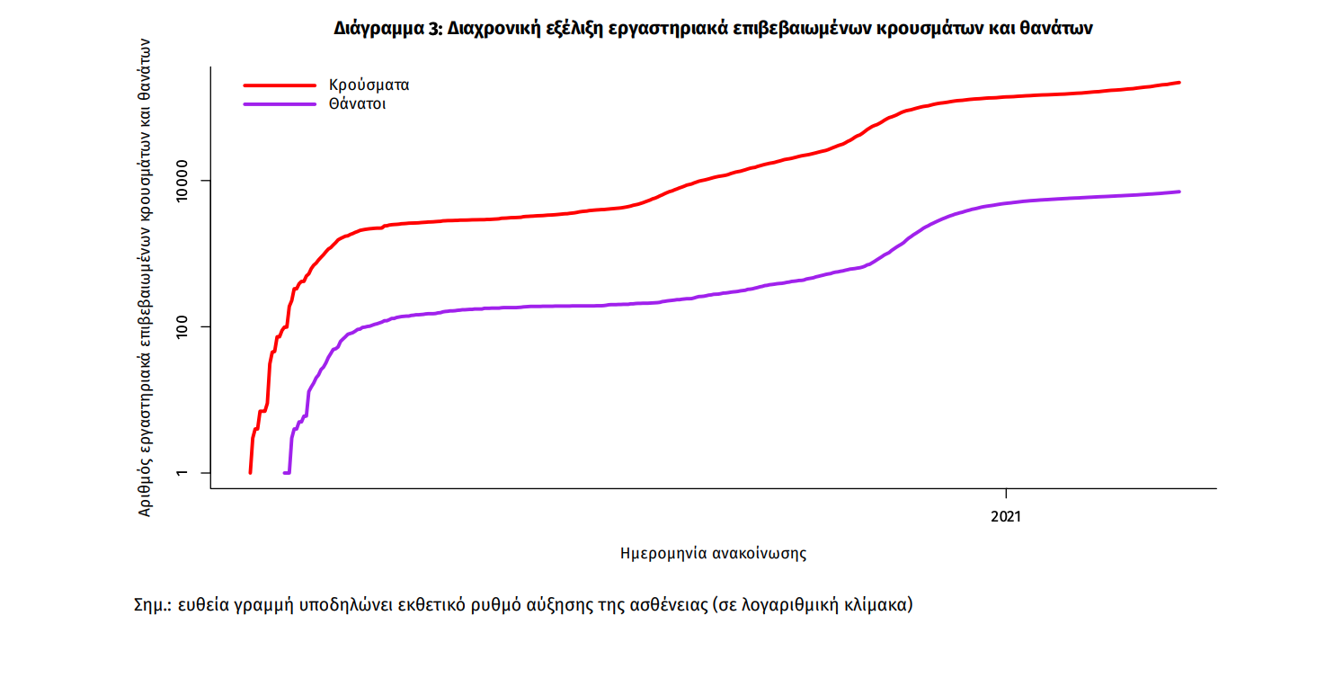 Η διαχρονική εξέλιξη των συνολικών κρουσμάτων και συνολικού αριθμού των θανάτων ασθενών COVID-19 παρουσιάζεται στο ακόλουθο διάγραμμα.
