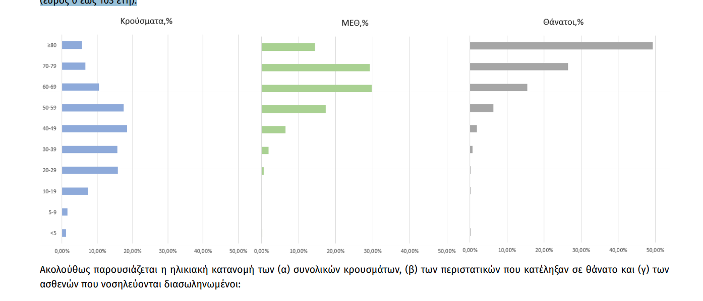 Ακολούθως παρουσιάζεται η ηλικιακή κατανομή των (α) συνολικών κρουσμάτων, (β) των περιστατικών που κατέληξαν σε θάνατο και (γ) των ασθενών που νοσηλεύονται διασωληνωμένοι: