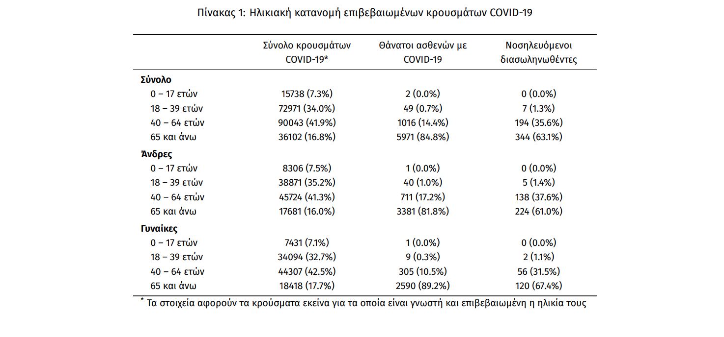 Ο αριθμός των ασθενών που νοσηλεύονται διασωληνωμένοι είναι 545 (67.5% άνδρες). Η διάμεση ηλικία τους είναι 68 έτη. To 84.2% έχει υποκείμενο νόσημα ή/και ηλικία 70 ετών και άνω. Από την αρχή της πανδημίας έχουν εξέλθει από τις ΜΕΘ 1.482 ασθενείς. Οι εισαγωγές2 νέων ασθενών Covid-19 στα νοσοκομεία της επικράτειας είναι 444 (ημερήσια μεταβολή -4.31%). Ο μέσος όρος εισαγωγών του επταημέρου είναι 430 ασθενείς. Hλικιακή κατανομή: Η διάμεση ηλικία των κρουσμάτων είναι 44 έτη (εύρος 0.2 έως 105 έτη), ενώ η διάμεση ηλικία των θανόντων είναι 79 έτη (εύρος 0 έως 103 έτη).