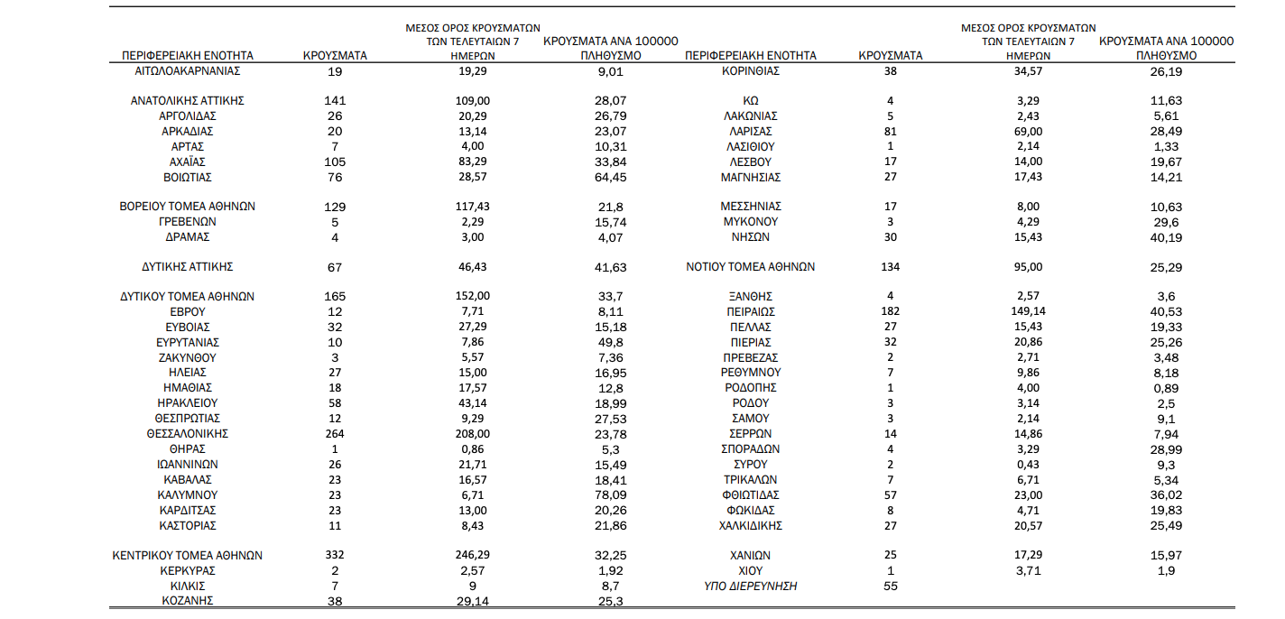 Οι νέοι θάνατοι ασθενών με COVID-19 είναι 52, ενώ από την έναρξη της επιδημίας έχουν καταγραφεί συνολικά 7.038 θάνατοι. Το 95.8% είχε υποκείμενο νόσημα ή/και ηλικία 70 ετών και άνω.