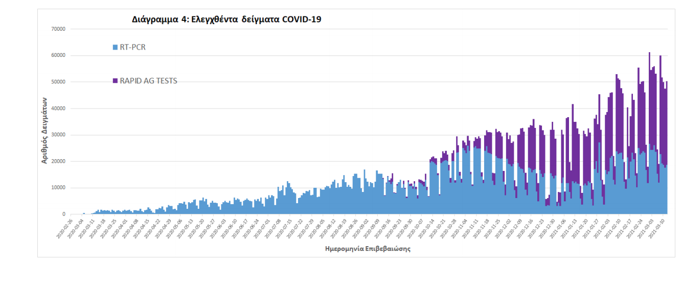 Δείγματα που έχουν ελεγχθεί: Από την 1η Ιανουαρίου 2020 μέχρι σήμερα, στα εργαστήρια που διενεργούν ελέγχους για τον νέο κορωνοϊό (SARS-CoV-2) και που δηλώνουν συστηματικά το σύνολο των δειγμάτων που ελέγχουν, έχουν συνολικά ελεγχθεί 3.910.466 κλινικά δείγματα ενώ από Μονάδες Υγείας και Κλιμάκια του ΕΟΔΥ που διενεργούν ελέγχους Rapid Ag έχουν ελεγχθεί 1.927.329 δείγματα. O μέσος όρος του επταημέρου είναι 43.331 δειγματοληπτικοί έλεγχοι.