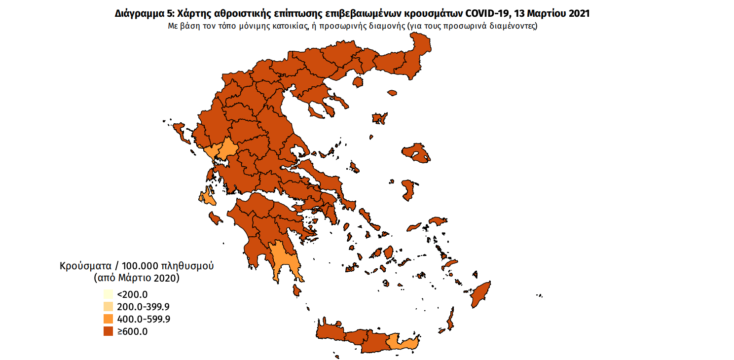 Κατανομή ανακοινωθέντων εγχώριων κρουσμάτων: Από το σύνολο των 2.512 νέων κρουσμάτων του νέου ιού στη χώρα 8 είναι εισαγόμενα εκ των οποίων 7 εντοπίστηκαν κατόπιν ελέγχων στις πύλες εισόδου της χώρας. Η κατανομή των 2.504 νέων εγχώριων κρουσμάτων ανά Περιφερειακή Ενότητα παρουσιάζεται στον κατωτέρω πίνακα.3 Πίνακας 2: Ημερήσιος αριθμός και κρούσματα ανά 100.000 πληθυσμού επιβεβαιωμένων εγχώριων κρουσμάτων COVID-19 ανά περιφερειακή ενότητα στις 13 Μαρτίου 2021