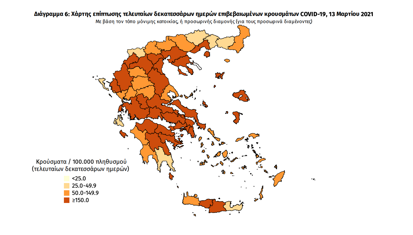 Γεωγραφική διασπορά: Ο χάρτης αποτυπώνει τη γεωγραφική κατανομή των συνολικών κρουσμάτων COVID-19 (από την αρχή της επιδημίας) ανά Περιφερειακή Ενότητα της χώρας, με βάση την δηλωθείσα διεύθυνση μόνιμης κατοικίας του ασθενούς, ή τη διεύθυνση προσωρινής διαμονής για τους τουρίστες και άλλους προσωρινά διαμένοντες στην Ελλάδα. Συμπεριλαμβάνονται τόσο κρούσματα με ιστορικό ταξιδίου (“εισαγόμενα”) όσο και κρούσματα με πιθανή εγχώρια μετάδοση.