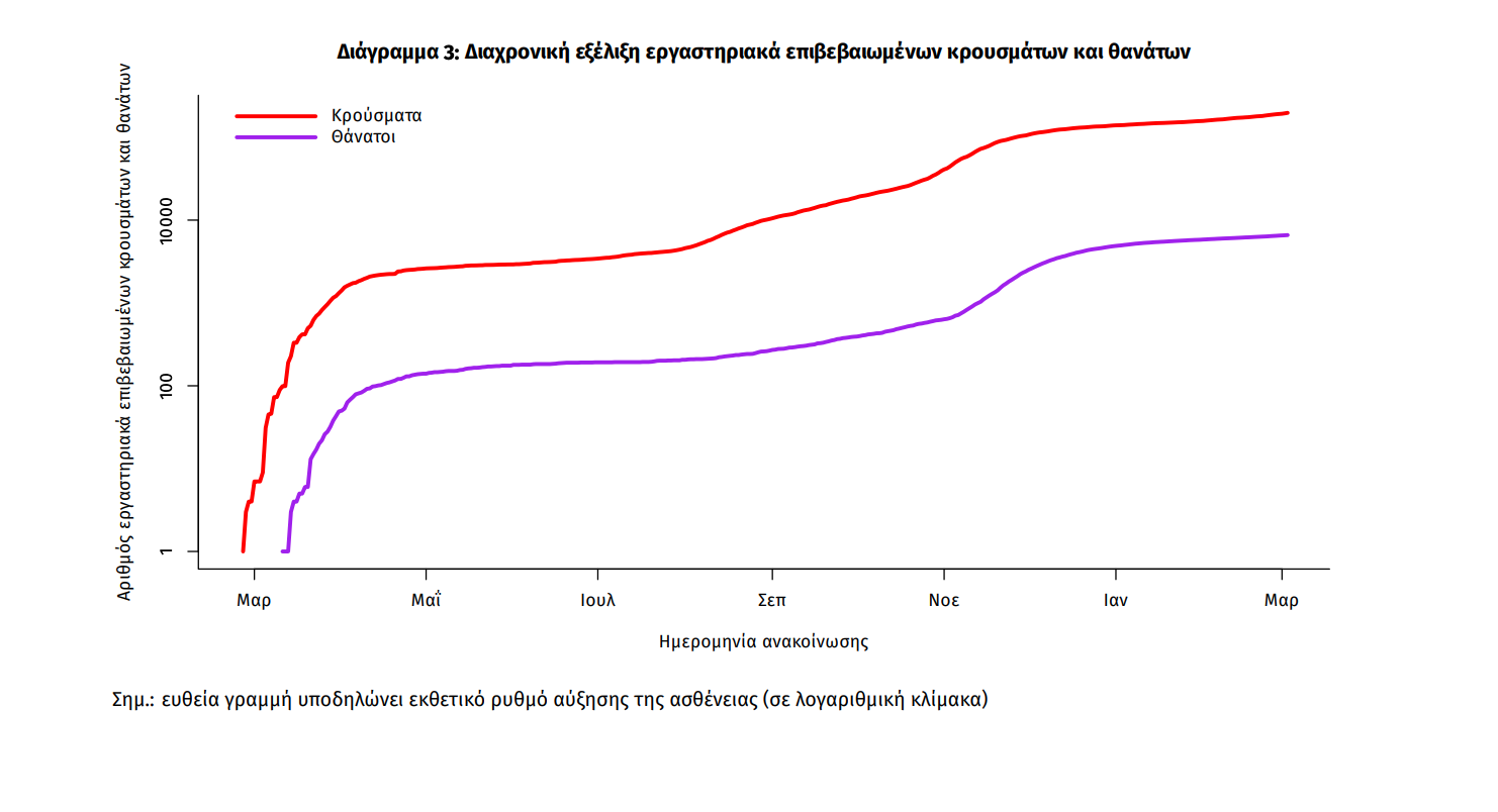 Η διαχρονική εξέλιξη των συνολικών κρουσμάτων και συνολικού αριθμού των θανάτων ασθενών COVID-19 παρουσιάζεται στο ακόλουθο διάγραμμα.