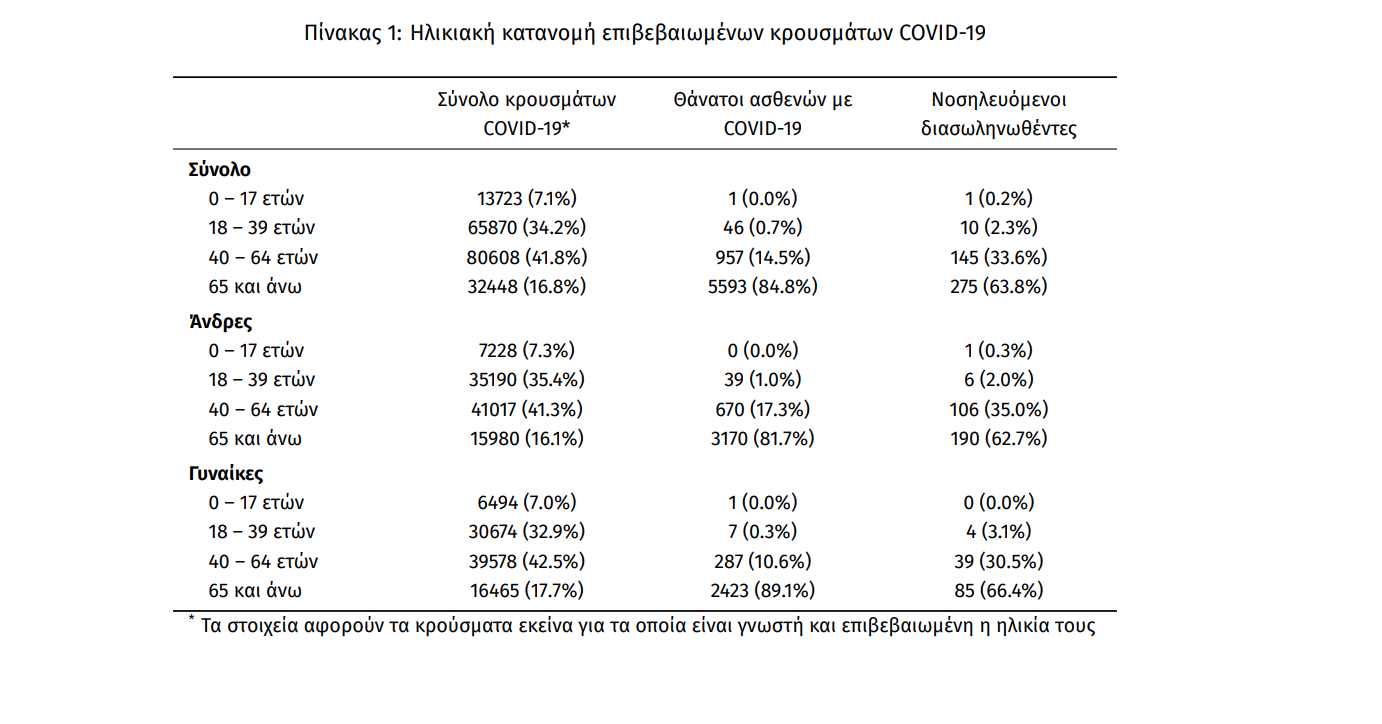 Ο αριθμός των ασθενών που νοσηλεύονται διασωληνωμένοι είναι 431 (70.1% άνδρες). Η διάμεση ηλικία τους είναι 68 έτη. To 84.9% έχει υποκείμενο νόσημα ή/και ηλικία 70 ετών και άνω. Από την αρχή της πανδημίας έχουν εξέλθει από τις ΜΕΘ 1.376 ασθενείς. Οι εισαγωγές2 νέων ασθενών Covid-19 στα νοσοκομεία της επικράτειας είναι 394 (ημερήσια μεταβολή +36.33%). Ο μέσος όρος εισαγωγών του επταημέρου είναι 304 ασθενείς. Hλικιακή κατανομή:Η διάμεση ηλικία των κρουσμάτων είναι 44 έτη (εύρος 0.2 έως 105 έτη), ενώ η διάμεση ηλικία των θανόντων είναι 79 έτη (εύρος 15 έως 103 έτη).
