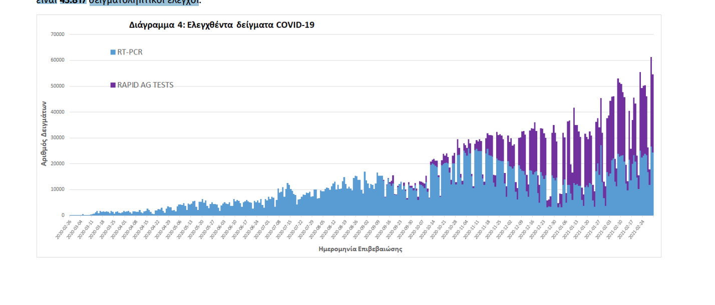 Δείγματα που έχουν ελεγχθεί: Από την 1η Ιανουαρίου 2020 μέχρι σήμερα, στα εργαστήρια που διενεργούν ελέγχους για τον νέο κορωνοϊό (SARS-CoV-2) και που δηλώνουν συστηματικά το σύνολο των δειγμάτων που ελέγχουν, έχουν συνολικά ελεγχθεί 3.711.523 κλινικά δείγματα ενώ από Μονάδες Υγείας και Κλιμάκια του ΕΟΔΥ που διενεργούν ελέγχους Rapid Ag έχουν ελεγχθεί 1.658.083 δείγματα. O μέσος όρος του επταημέρου είναι 43.817 δειγματοληπτικοί έλεγχοι