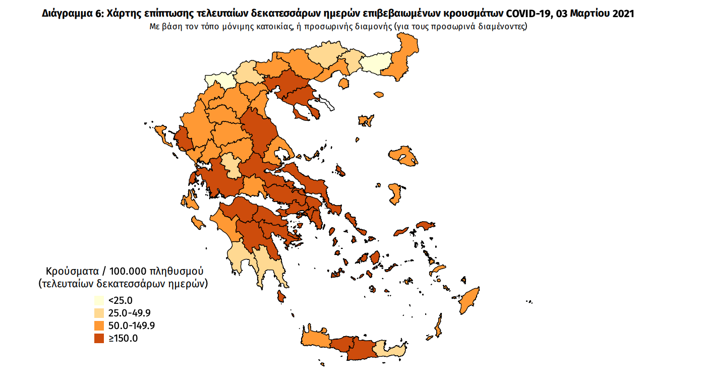 Γεωγραφική διασπορά: Ο χάρτης αποτυπώνει τη γεωγραφική κατανομή των συνολικών κρουσμάτων COVID-19 (από την αρχή της επιδημίας) ανά Περιφερειακή Ενότητα της χώρας, με βάση την δηλωθείσα διεύθυνση μόνιμης κατοικίας του ασθενούς, ή τη διεύθυνση προσωρινής διαμονής για τους τουρίστες και άλλους προσωρινά διαμένοντες στην Ελλάδα. Συμπεριλαμβάνονται τόσο κρούσματα με ιστορικό ταξιδίου (“εισαγόμενα”) όσο και κρούσματα με πιθανή εγχώρια μετάδοση.