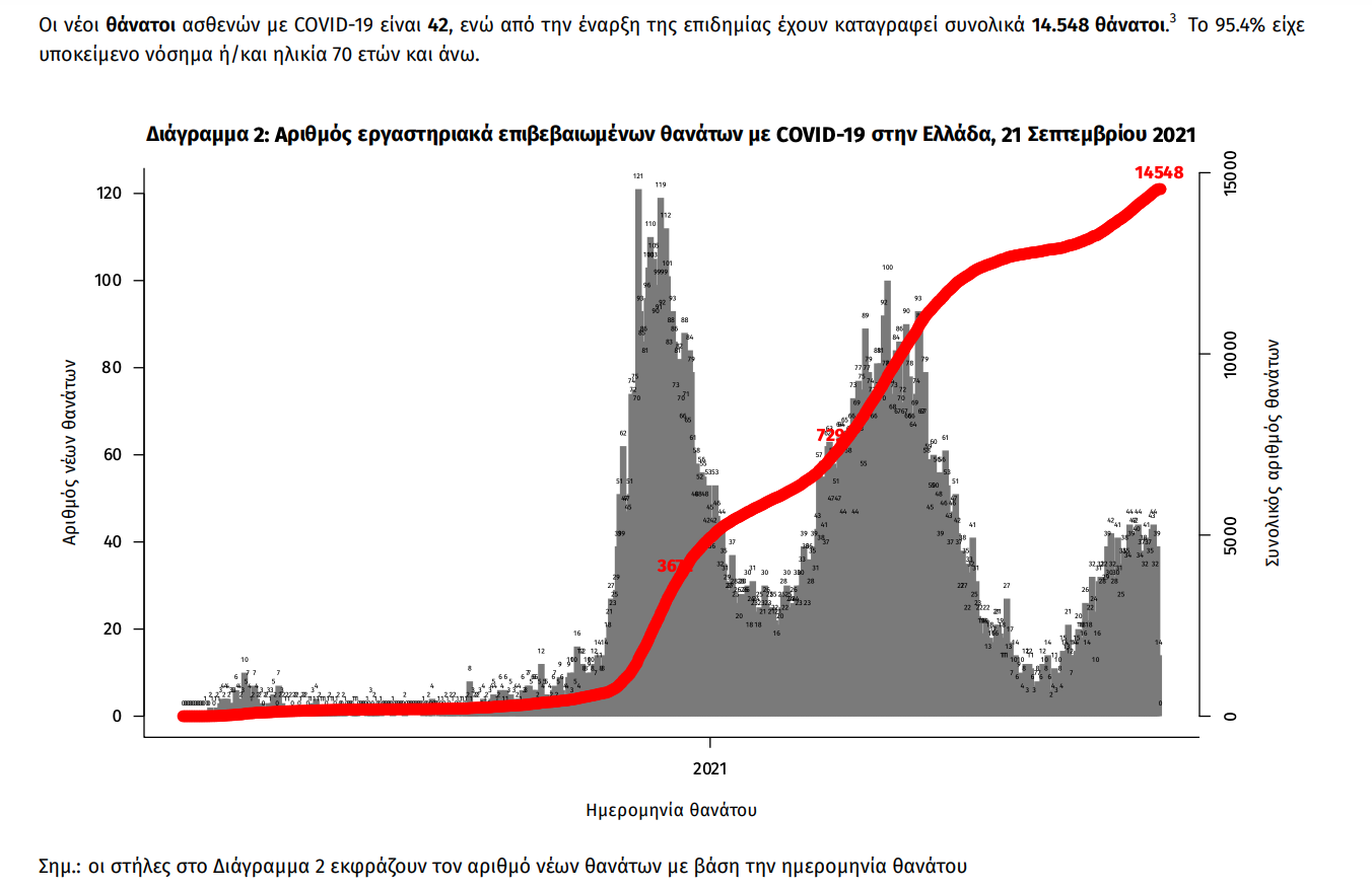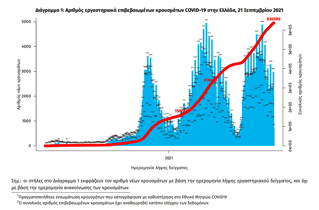 Τα στοιχεία που παρουσιάζονται αφορούν περιστατικά από την επιδημιολογική επιτήρηση της νόσου από το νέο κορωνοϊό (COVID19), με βάση τα δεδομένα που έχουν δηλωθεί στον ΕΟΔΥ και καταγραφεί μέχρι τις 21 Σεπτεμβρίου 2021 (ώρα 15:00). Τα νέα εργαστηριακά επιβεβαιωμένα κρούσματα της νόσου που καταγράφηκαν τις τελευταίες 24 ώρες είναι 3.040, εκ των οποίων 8 εντοπίστηκαν κατόπιν ελέγχων στις πύλες εισόδου της χώρας. Ο συνολικός αριθμός των κρουσμάτων ανέρχεται σε 636.596 (ημερήσια μεταβολή +0.6%), εκ των οποίων 51.0% άνδρες. 1 2 Με βάση τα επιβεβαιωμένα κρούσματα των τελευταίων 7 ημερών, 134 θεωρούνται σχετιζόμενα με ταξίδι από το εξωτερικό και 3.178 είναι σχετιζόμενα με ήδη γνωστό κρούσμα. Ημερήσια εξέλιξη της πανδημίας: Η ημερήσια κατανομή των επιβεβαιωμένων κρουσμάτων είναι η ακόλουθη (η γραμμή παριστάνει την συνολική, αθροιστική κατανομή των κρουσμάτων).