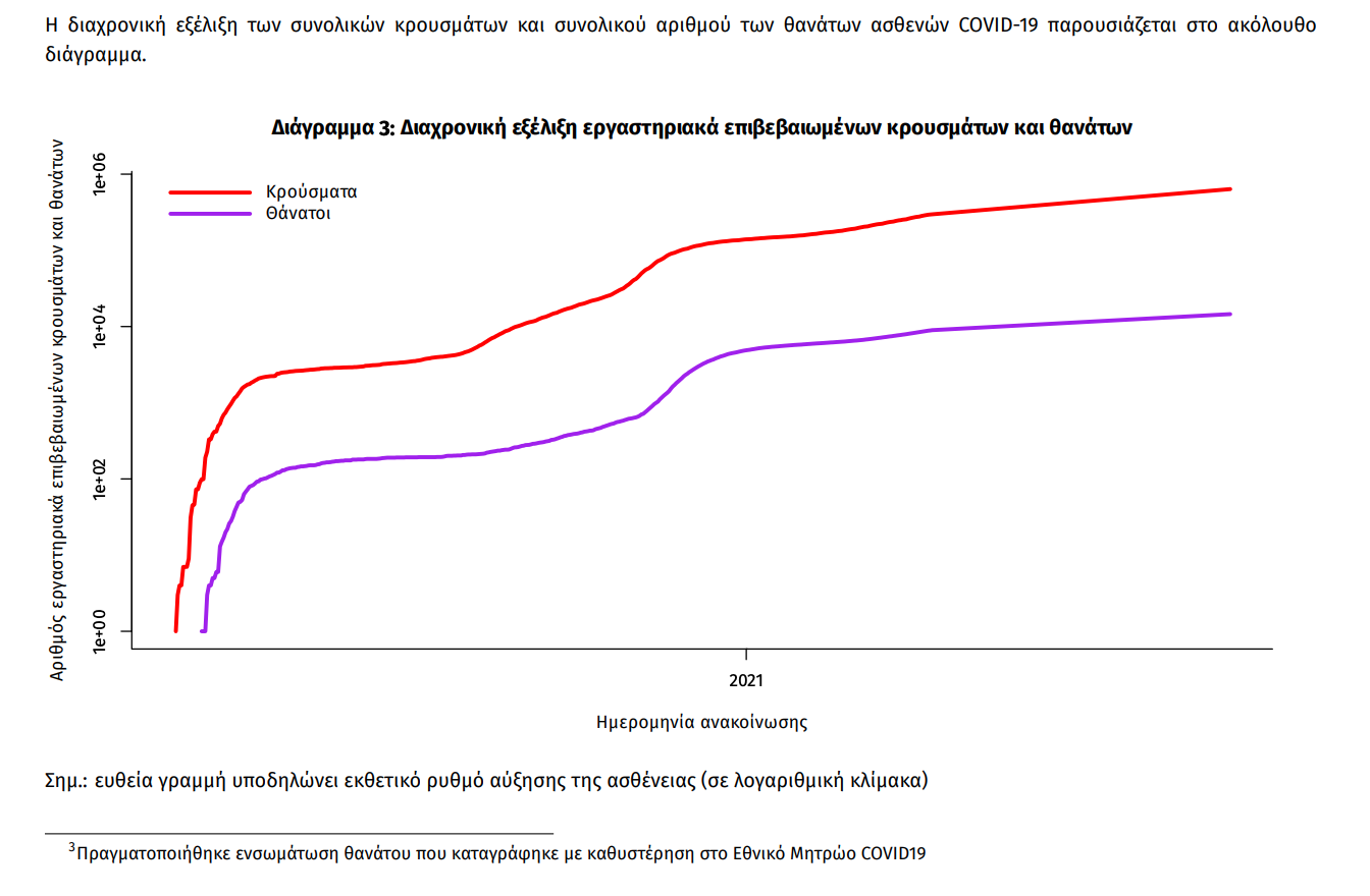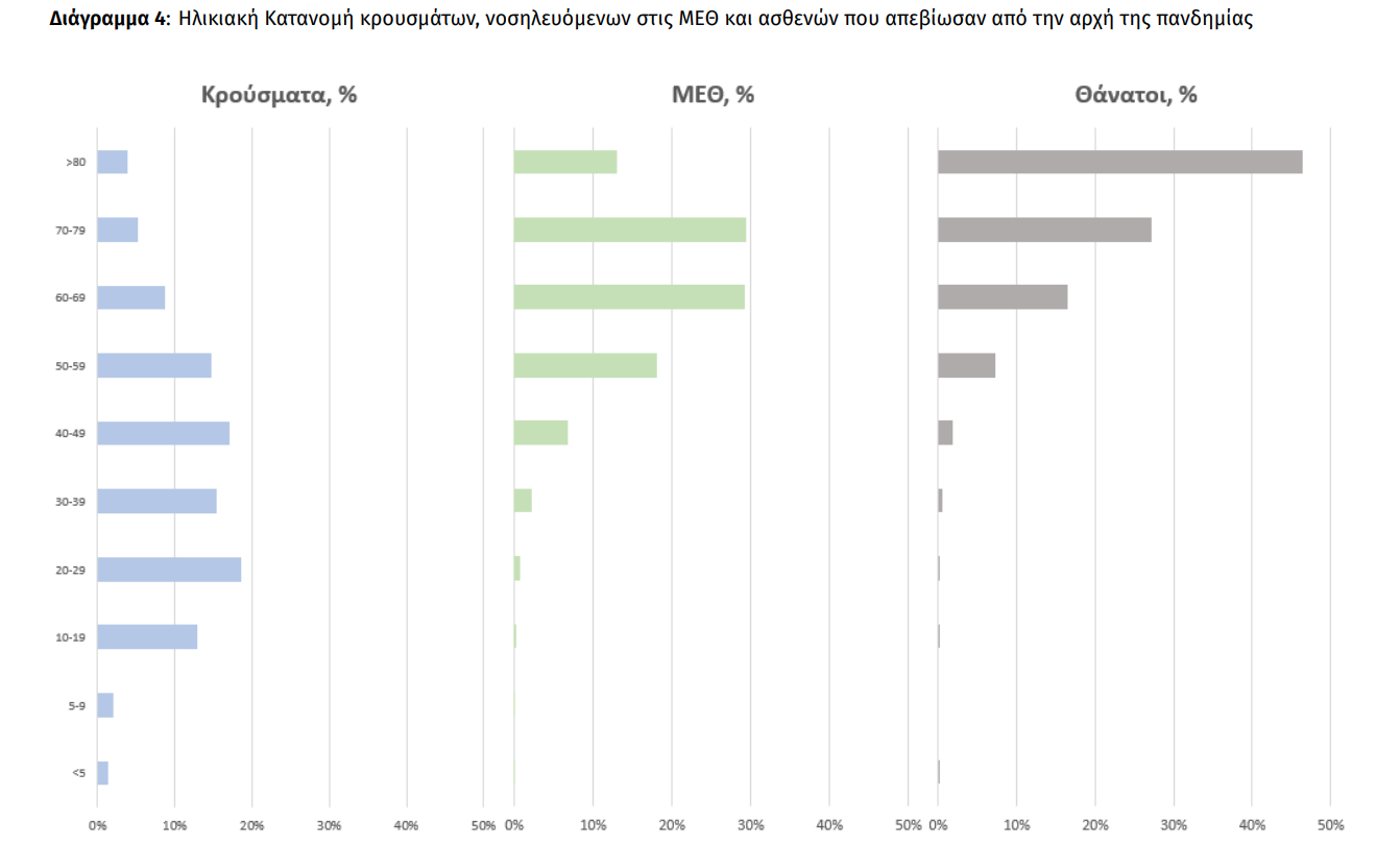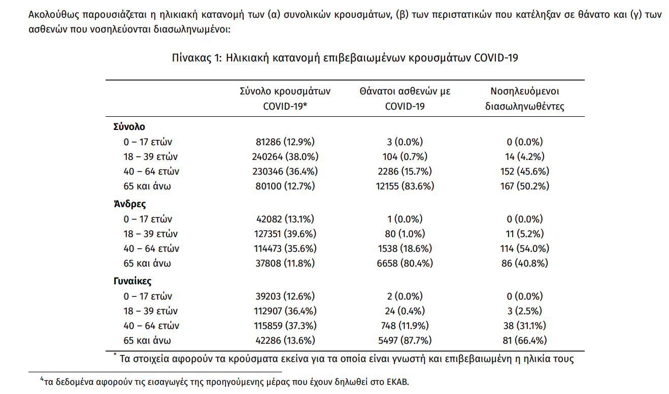 Ο αριθμός των ασθενών που νοσηλεύονται διασωληνωμένοι είναι 333 (63.4% άνδρες). Η διάμεση ηλικία τους είναι 65 έτη. To 80.5% έχει υποκείμενο νόσημα ή/και ηλικία 70 ετών και άνω. Μεταξύ των ασθενών που νοσηλεύονται διασωληνωμένοι, 304 (91.29%) είναι ανεμβολίαστοι ή μερικώς εμβολιασμένοι και 29 (8.71%) είναι πλήρως εμβολιασμένοι. Από την αρχή της πανδημίας έχουν εξέλθει από τις ΜΕΘ 3.096 ασθενείς. Οι εισαγωγές4 νέων ασθενών Covid-19 στα νοσοκομεία της επικράτειας είναι 212 (ημερήσια μεταβολή +65.62%). Ο μέσος όρος εισαγωγών του επταημέρου είναι 192 ασθενείς.Η διάμεση ηλικία των κρουσμάτων είναι 39 έτη (εύρος 0.2 έως 106 έτη), ενώ η διάμεση ηλικία των θανόντων είναι 78 έτη (εύρος 0.2 έως 106 έτη).