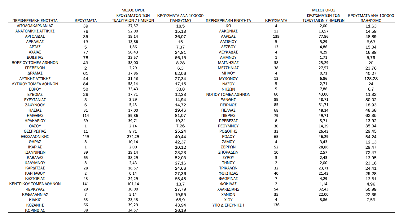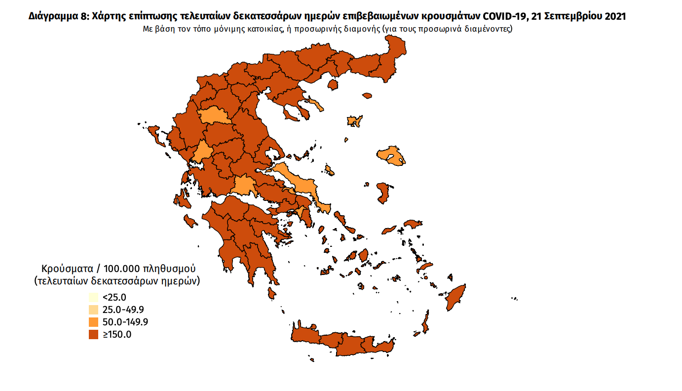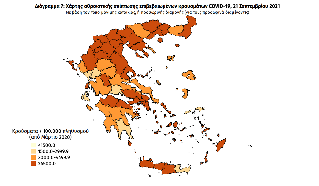 Κατανομή ανακοινωθέντων εγχώριων κρουσμάτων: Από το σύνολο των 3.040 κρουσμάτων του νέου ιού στη χώρα 19 είναι εισαγόμενα εκ των οποίων 8 εντοπίστηκαν κατόπιν ελέγχων στις πύλες εισόδου της χώρας. Η κατανομή των 3.021 νέων εγχώριων κρουσμάτων ανά Περιφερειακή Ενότητα παρουσιάζεται στον κατωτέρω πίνακα.5 Πίνακας 2: Ημερήσιος αριθμός και κρούσματα ανά 100.000 πληθυσμού επιβεβαιωμένων εγχώριων κρουσμάτων COVID-19 ανά περιφερειακή ενότητα στις 21 Σεπτεμβρίου 2021