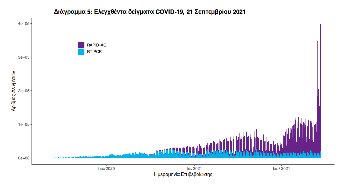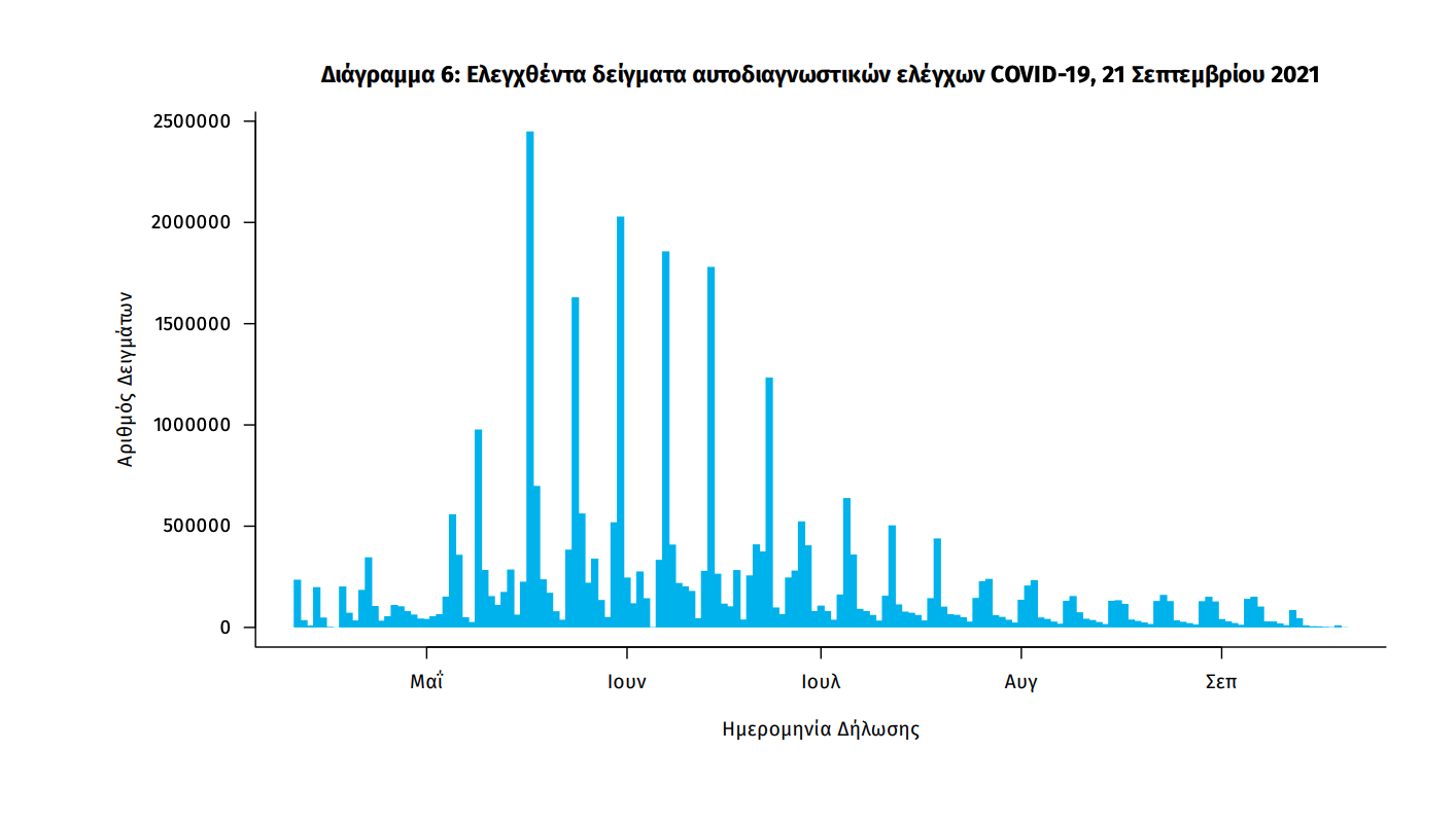 Δείγματα που έχουν ελεγχθεί: Από την 1η Ιανουαρίου 2020 μέχρι σήμερα, στα εργαστήρια που διενεργούν ελέγχους για τον νέο κορωνοϊό (SARS-CoV-2) και που δηλώνουν συστηματικά το σύνολο των δειγμάτων που ελέγχουν, έχουν συνολικά ελεγχθεί 6.514.514 κλινικά δείγματα ενώ από Μονάδες Υγείας και Κλιμάκια του ΕΟΔΥ που διενεργούν ελέγχους Rapid Ag έχουν ελεγχθεί 11.900.956 δείγματα. O μέσος όρος του επταημέρου είναι 192.409 δειγματοληπτικοί έλεγχοι. Αυτοδιαγνωστικοί έλεγχοι (Self-tests): Έως 20 Σεπτεμβρίου 2021, έχουν καταγραφεί ηλεκτρονικά 33.730.805 δηλώσεις αποτελέσματος αυτοδιαγνωστικού ελέγχου, ενώ 1.695.802 άτομα προσήλθαν για επανέλεγχο. Mαζικές Δειγματοληψίες ΕΟΔΥ: Στις 20 Σεπτεμβρίου 2021, πραγματοποιήθηκαν 155 δράσεις δειγματοληπτικών ελέγχων από τις Κινητές Ομάδες Υγείας (ΚΟΜΥ) του ΕΟΔΥ, στις οποίες διενεργήθηκαν 22.099 έλεγχοι Rapid Ag και ανευρέθηκαν 482 θετικά (2,18%).