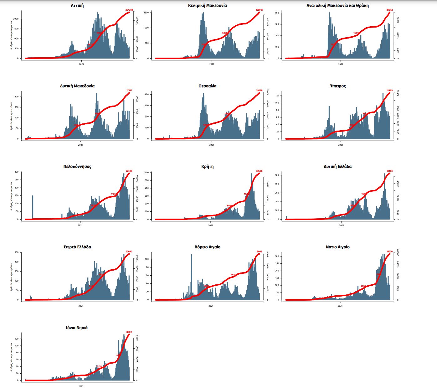Παράρτημα 1: Επιδημικές καμπύλες κρουσμάτων COVID-19 με βάση την δηλωθείσα διεύθυνση μόνιμης κατοικίας του κρούσματος ή τη διεύθυνση προσωρινής διαμονής για τους τουρίστες και άλλους προσωρινά διαμένοντες στην Ελλάδα. Συμπεριλαμβάνονται τόσο κρούσματα με ιστορικό ταξιδίου όσο και κρούσματα με πιθανή εγχώρια μετάδοση.