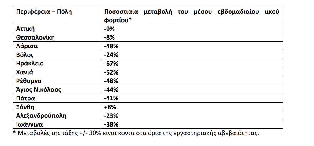 Οι καθαρά πτωτικές τάσεις κυμάνθηκαν από – 38% στα Ιωάννινα μέχρι – 67% στο Ηράκλειο, ενώ οριακές ήταν οι μειώσεις που παρατηρήθηκαν στην Αλεξανδρούπολη (-23%) και στο Βόλο (-24%).