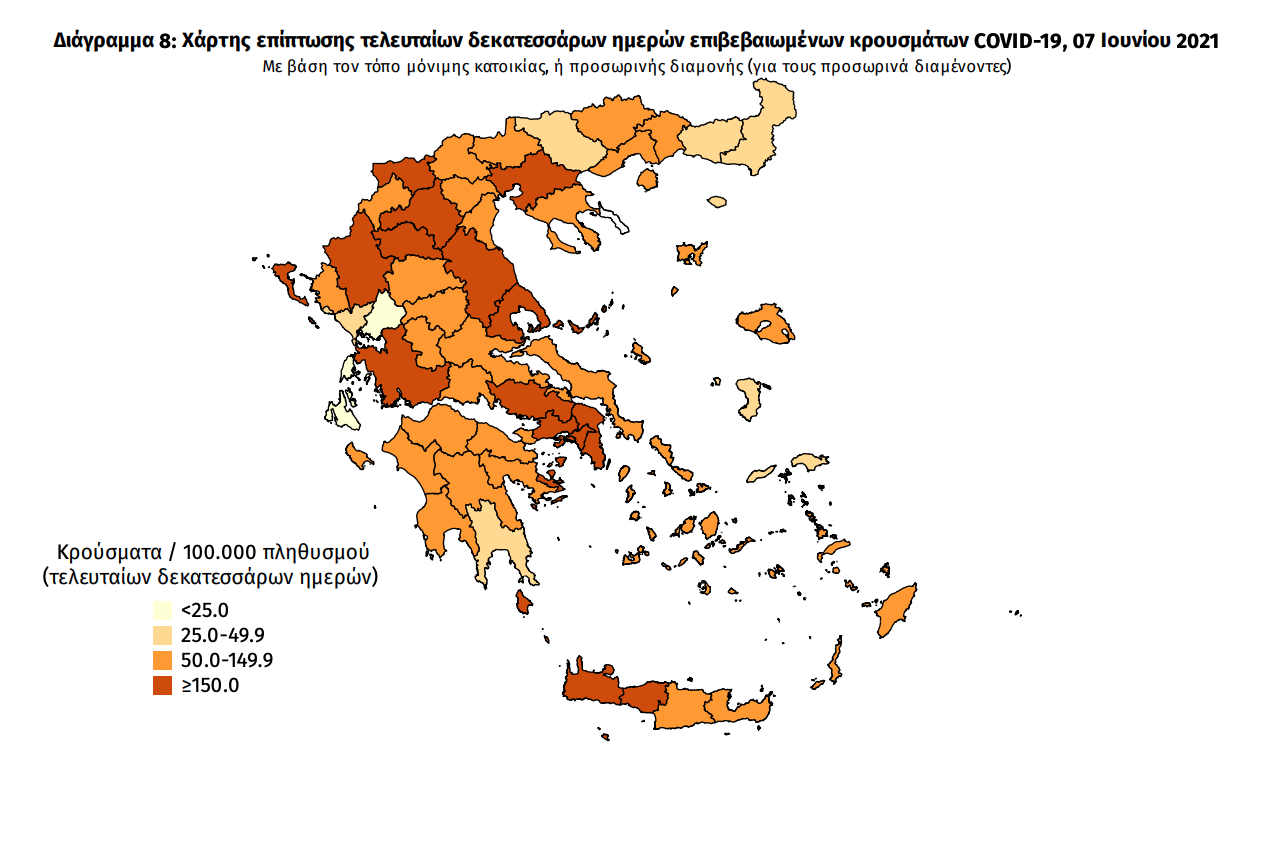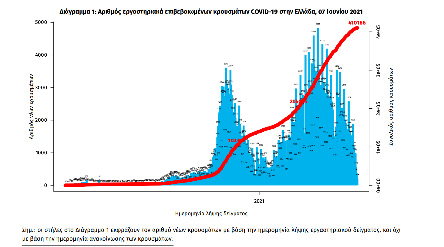 Τα στοιχεία που παρουσιάζονται αφορούν περιστατικά από την επιδημιολογική επιτήρηση της νόσου από το νέο κορωνοϊό (COVID19), με βάση τα δεδομένα που έχουν δηλωθεί στον ΕΟΔΥ και καταγραφεί μέχρι τις 07 Ιουνίου 2021 (ώρα 15:00). Τα νέα εργαστηριακά επιβεβαιωμένα κρούσματα της νόσου που καταγράφηκαν τις τελευταίες 24 ώρες είναι 808, εκ των οποίων 3 εντοπίστηκαν κατόπιν ελέγχων στις πύλες εισόδου της χώρας.