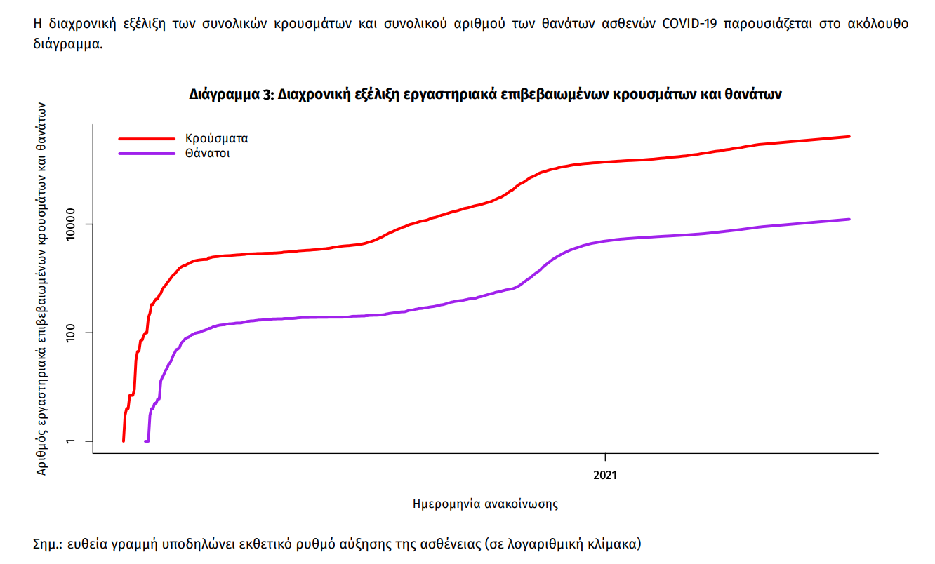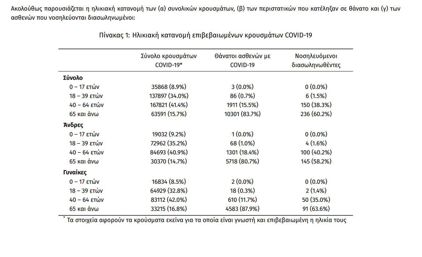 Ο αριθμός των ασθενών που νοσηλεύονται διασωληνωμένοι είναι 392 (63.4% άνδρες). Η διάμεση ηλικία τους είναι 67 έτη. To 86.5% έχει υποκείμενο νόσημα ή/και ηλικία 70 ετών και άνω. Από την αρχή της πανδημίας έχουν εξέλθει από τις ΜΕΘ 2.510 ασθενείς. Οι εισαγωγές2 νέων ασθενών Covid-19 στα νοσοκομεία της επικράτειας είναι 129 (ημερήσια μεταβολή -22.29%). Ο μέσος όρος εισαγωγών του επταημέρου είναι 159 ασθενείς.Η διάμεση ηλικία των κρουσμάτων είναι 43 έτη (εύρος 0.2 έως 106 έτη), ενώ η διάμεση ηλικία των θανόντων είναι 78 έτη (εύρος 0.2 έως 106 έτη)