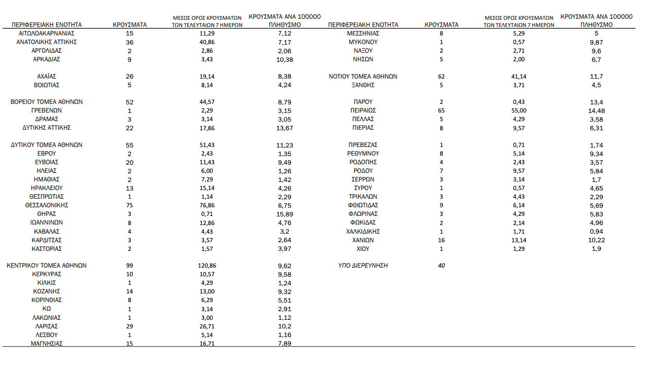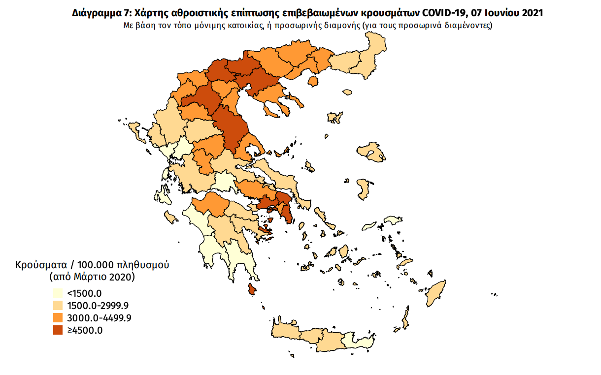 Κατανομή ανακοινωθέντων εγχώριων κρουσμάτων: Από το σύνολο των 808 νέων κρουσμάτων του νέου ιού στη χώρα 6 είναι εισαγόμενα εκ των οποίων 3 εντοπίστηκαν κατόπιν ελέγχων στις πύλες εισόδου της χώρας Η κατανομή των 802 νέων εγχώριων κρουσμάτων ανά Περιφερειακή Ενότητα παρουσιάζεται στον κατωτέρω πίνακα.3 Πίνακας 2: Ημερήσιος αριθμός και κρούσματα ανά 100.000 πληθυσμού επιβεβαιωμένων εγχώριων κρουσμάτων COVID-19 ανά περιφερειακή ενότητα στις 07 Ιουνίου 2021