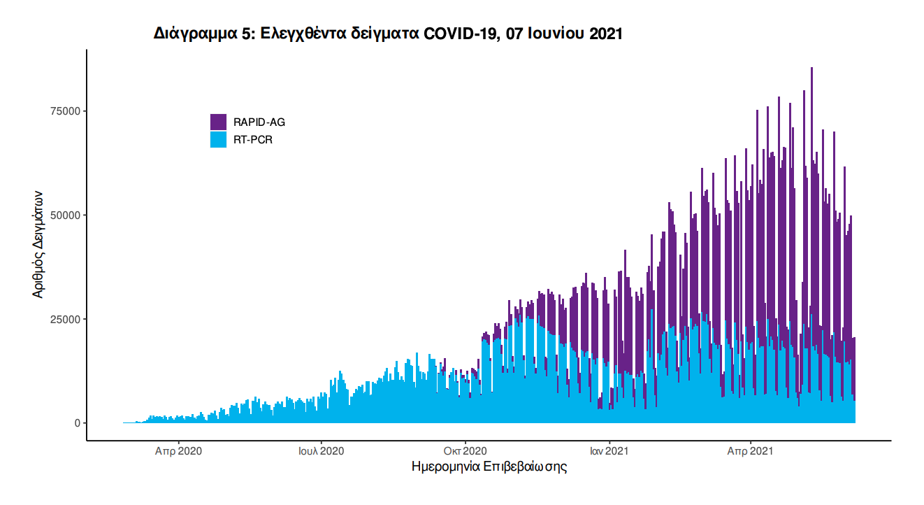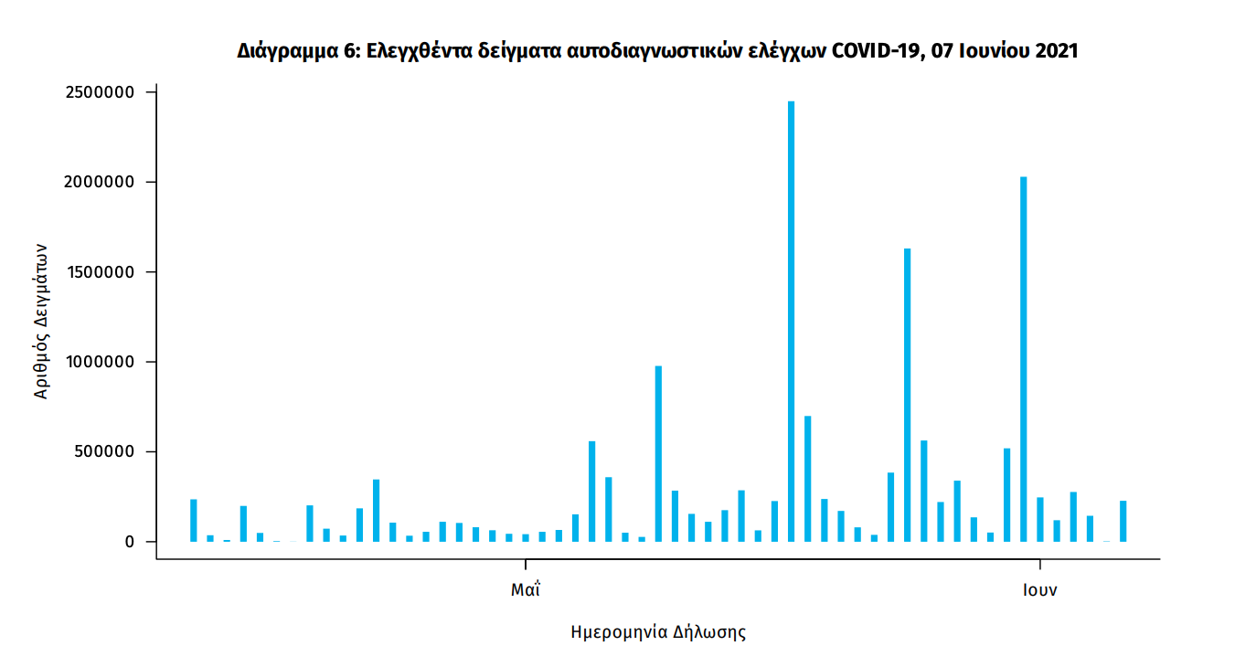 Δείγματα που έχουν ελεγχθεί: Από την 1η Ιανουαρίου 2020 μέχρι σήμερα, στα εργαστήρια που διενεργούν ελέγχους για τον νέο κορωνοϊό (SARS-CoV-2) και που δηλώνουν συστηματικά το σύνολο των δειγμάτων που ελέγχουν, έχουν συνολικά ελεγχθεί 5.159.892 κλινικά δείγματα ενώ από Μονάδες Υγείας και Κλιμάκια του ΕΟΔΥ που διενεργούν ελέγχους Rapid Ag έχουν ελεγχθεί 4.652.576 δείγματα. O μέσος όρος του επταημέρου είναι 41.700 δειγματοληπτικοί έλεγχοι. Αυτοδιαγνωστικοί έλεγχοι (Self-tests): Έως 06 Ιουνίου 2021, έχουν καταγραφεί ηλεκτρονικά 16.121.404 δηλώσεις αποτελέσματος αυτοδιαγνωστικού ελέγχου, ενώ 322.096 άτομα προσήλθαν για επανέλεγχο. Mαζικές Δειγματοληψίες ΕΟΔΥ: Στις 06 Ιουνίου 2021, πραγματοποιήθηκαν 40 δράσεις δειγματοληπτικών ελέγχων από τις Κινητές Ομάδες Υγείας (ΚΟΜΥ) του ΕΟΔΥ, στις οποίες διενεργήθηκαν 7.199 έλεγχοι Rapid Ag και ανευρέθηκαν 69 θετικά (0,96%).