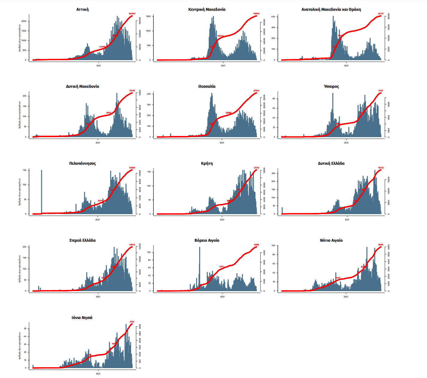 Παράρτημα 1: Επιδημικές καμπύλες κρουσμάτων COVID-19 με βάση την δηλωθείσα διεύθυνση μόνιμης κατοικίας του κρούσματος ή τη διεύθυνση προσωρινής διαμονής για τους τουρίστες και άλλους προσωρινά διαμένοντες στην Ελλάδα. Συμπεριλαμβάνονται τόσο κρούσματα με ιστορικό ταξιδίου όσο και κρούσματα με πιθανή εγχώρια μετάδοση.