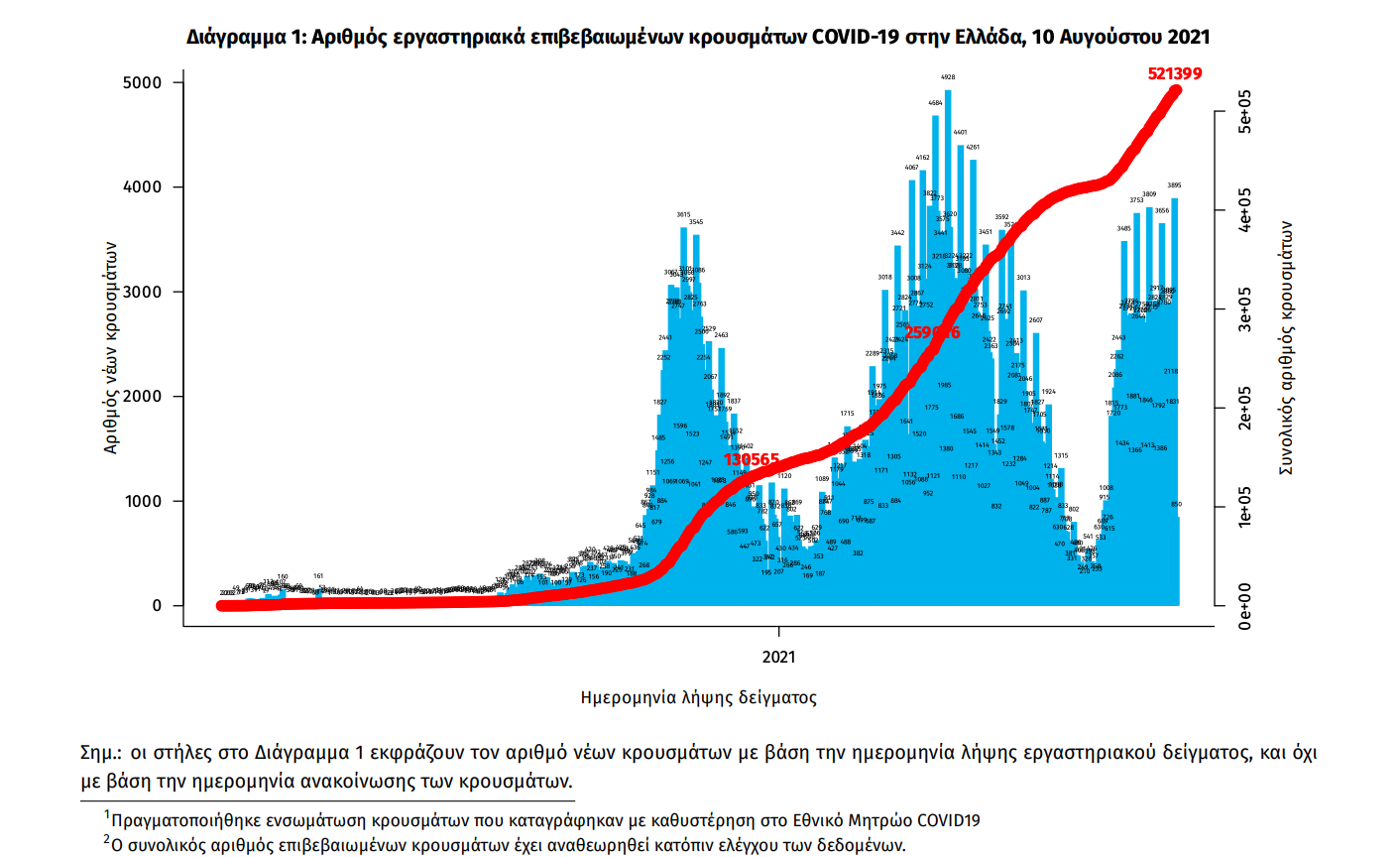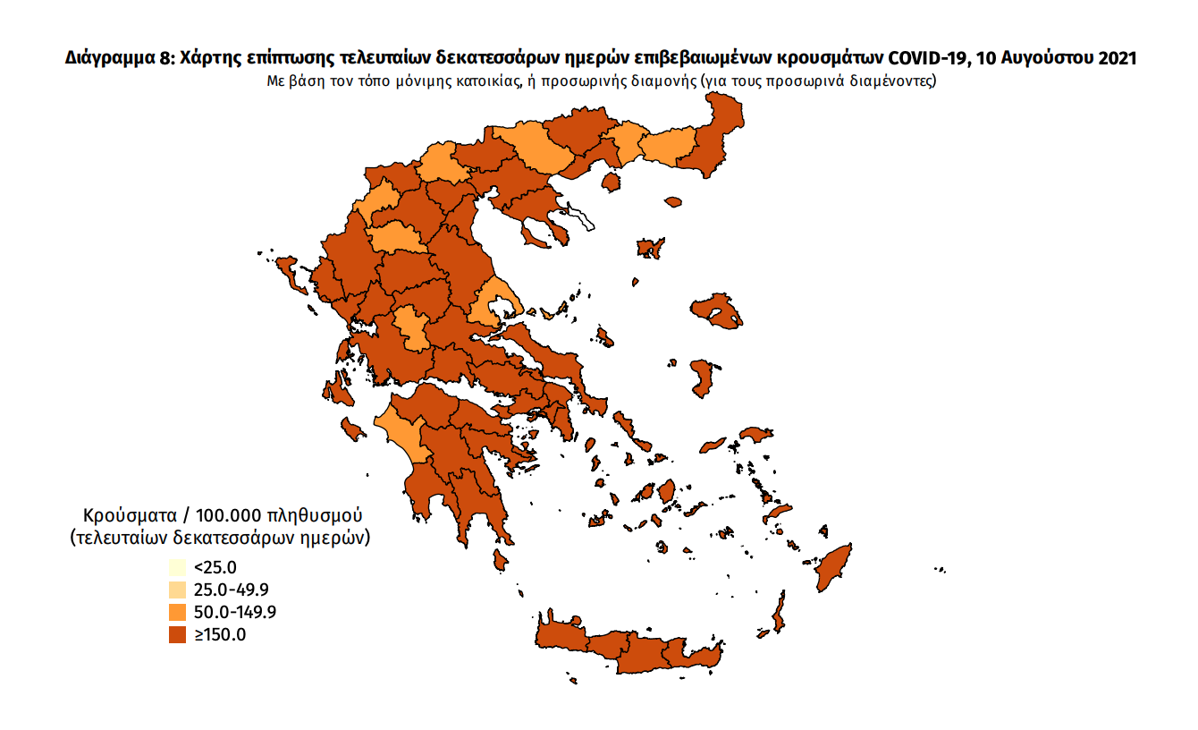 Τα στοιχεία που παρουσιάζονται αφορούν περιστατικά από την επιδημιολογική επιτήρηση της νόσου από το νέο κορωνοϊό (COVID19), με βάση τα δεδομένα που έχουν δηλωθεί στον ΕΟΔΥ και καταγραφεί μέχρι τις 10 Αυγούστου 2021 (ώρα 15:00). Τα νέα εργαστηριακά επιβεβαιωμένα κρούσματα της νόσου που καταγράφηκαν τις τελευταίες 24 ώρες είναι 4.181, εκ των οποίων 11 εντοπίστηκαν κατόπιν ελέγχων στις πύλες εισόδου της χώρας.