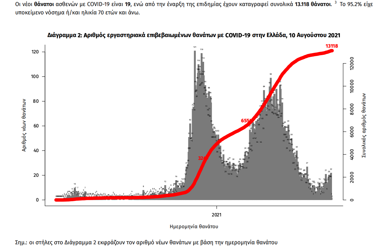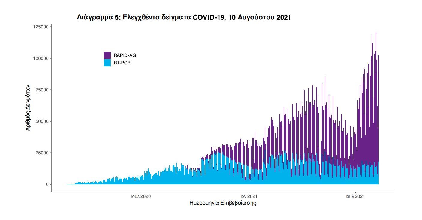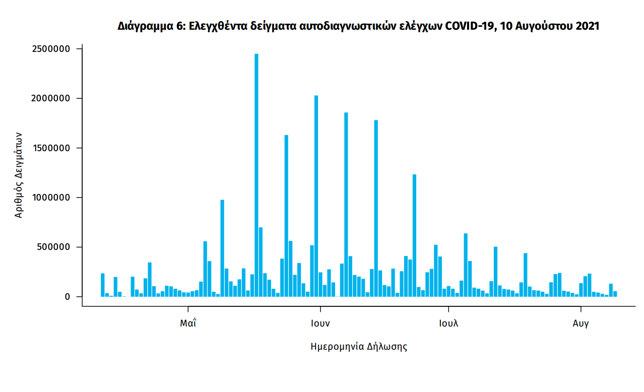 Δείγματα που έχουν ελεγχθεί: Από την 1η Ιανουαρίου 2020 μέχρι σήμερα, στα εργαστήρια που διενεργούν ελέγχους για τον νέο κορωνοϊό (SARS-CoV-2) και που δηλώνουν συστηματικά το σύνολο των δειγμάτων που ελέγχουν, έχουν συνολικά ελεγχθεί 5.929.425 κλινικά δείγματα ενώ από Μονάδες Υγείας και Κλιμάκια του ΕΟΔΥ που διενεργούν ελέγχους Rapid Ag έχουν ελεγχθεί 7.718.378 δείγματα. O μέσος όρος του επταημέρου είναι 88.937 δειγματοληπτικοί έλεγχοι. Αυτοδιαγνωστικοί έλεγχοι (Self-tests): Έως 09 Αυγούστου 2021, έχουν καταγραφεί ηλεκτρονικά 31.247.841 δηλώσεις αποτελέσματος αυτοδιαγνωστικού ελέγχου, ενώ 930.795 άτομα προσήλθαν για επανέλεγχο. Mαζικές Δειγματοληψίες ΕΟΔΥ: Στις 09 Αυγούστου 2021, πραγματοποιήθηκαν 126 δράσεις δειγματοληπτικών ελέγχων από τις Κινητές Ομάδες Υγείας (ΚΟΜΥ) του ΕΟΔΥ, στις οποίες διενεργήθηκαν 26.869 έλεγχοι Rapid Ag και ανευρέθηκαν 917 θετικά (3,41%)